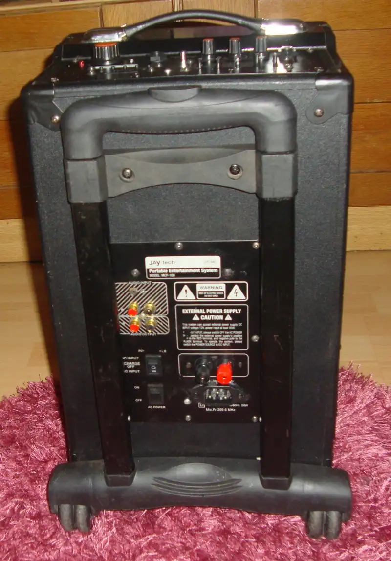 A Jay-tech MCP100A lejátszás okostelefonokkal vagy tabletekkel ill. memóriakártyákkal egy SD kártyanyíláson keresztül vagy USB pen drive-okkal az USB csatlakozófelületen át. Egy RCA csatlakozó 6 3 mm-es mikrofoncsatlakozó és egy Elektromosgitárhoz való bemenet egészítik ki a sokféle csatlakozási lehetőséget. A 60 W-os RMS (450 W PMPO) teljesítménnyel nagy termeket vagy szabad térségeket is könnyű behangosítani. Hálózati csatlakozás nélkül a hangrendszer a beépített akkuval 4 órán keresztül használható.