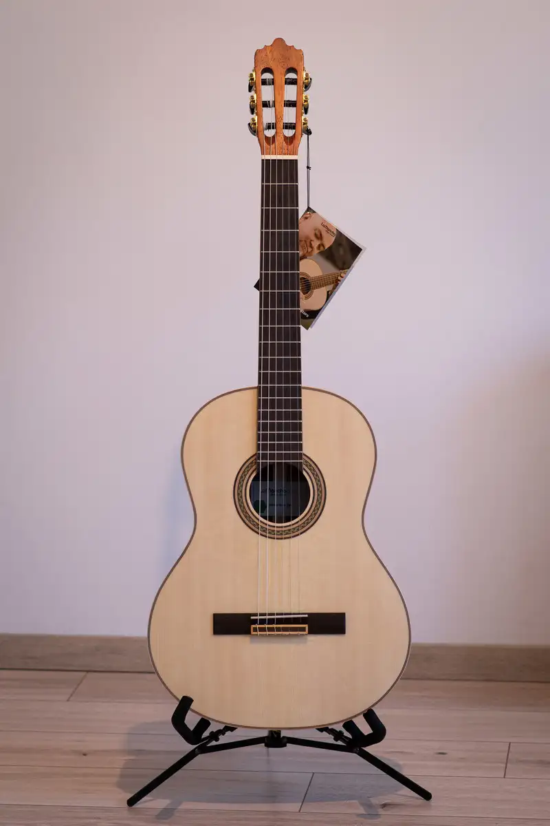 Eladó a képeken látható új La Mancha Esmeralda SM típusú klasszikus gitár.Tömör német fenyő tetővel, padouk oldal és hátlappal.