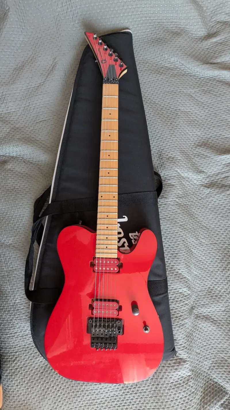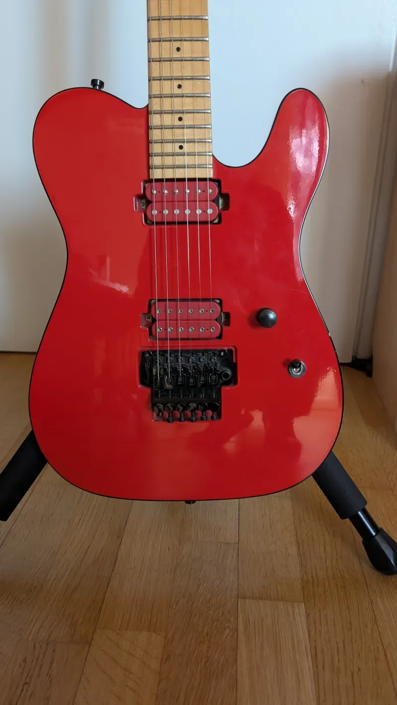 Volt szerencsém az első tulajával is beszélni. Abszolút csúcs 2008-as USA Charvel elektronika, eredeti Floyd tremolo és a Dimarziótól egyedileg rendelt színben passzoló pickupok kerültek bele. Emelett vékony sport nyakat kapott, mellette van benne anyag bőven, súlyra is inkább 4kg körüli.