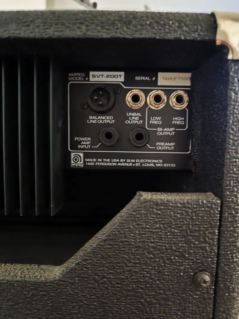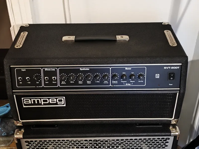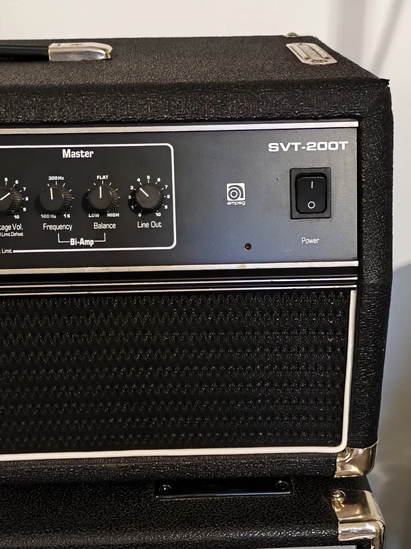 The Ampeg SVT-200T is a versatile, solid-state bass amplifier head produced between 1987 and 1994, delivering 200W RMS at 8ohm or 320W at 4ohm. Known for its durable, ˝old-school˝ tone, it features a 6-band rotary EQ with push/pull frequency shifting, a built-in limiter, and balanced XLR direct out, making it a reliable choice for gigging.