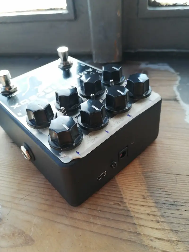Tápegység nélkül, alján velcro. A maszkoló szalag egy mozdulattal eltávolítható, de jó szolgálatot tesz, mivel a potik körül nincs ˝skálázva a sasszé˝.