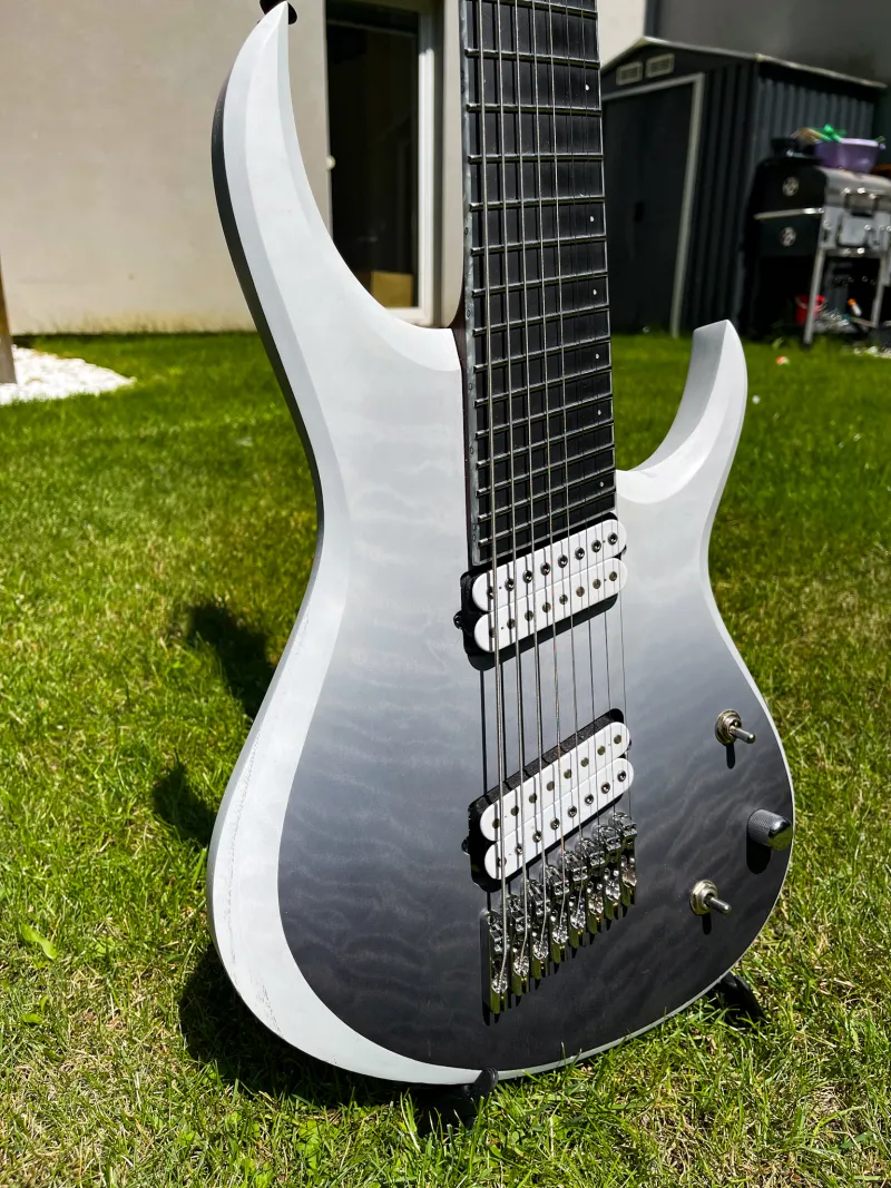 I`m selling my custom-made Aviator Fury 8 FF. Custom shop Guitar in the same quality as Mayones, Skervesen, Padalka, Vik, etc. Lightweight Swamp Ash Body with 5A Quilted maple top, wenge/maple 5-piece neck with pearl binding, richlite fingerboard, stainless steel frets, scale length is 26-28``. Pickups are Bareknuckle Painkiller at the bridge and Coldsweat on the neck, ABM single saddle bridge, split coil switch, and Hipshot locking tuners. Original hardcase included. The guitar has some minor wear and tear, since it was used in the studio and also on stage with my band Modern Day Babylon.. Shipping from the Czech Republic, insured, tracked.Szállítás
