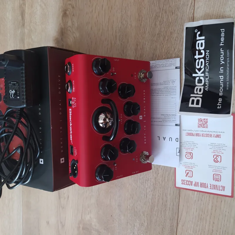 Eladó egy karcmentes, csak szobában, asztalon használt Blackstar Dept 10 Dual Drive 4 csatornás (clean-től high gain-ig) csöves overdrive. A pedálon 3 sávos EQ és egy ISF poti található, amelyen az EQ karaktere állítható be az amerikai hangzásvilágtól az angolig (pl. Marshall - Mesa Rectifier).Rendkívül rugalmas, sokoldaló pedál, használható erősító tiszta vagy overdrive csatornája előtt, mint előfok, vagy hagyományos booster/overdrive, de arra is van lehetőség, hogy XLR kábellel vagy a Cab Rig kimenetén keresztül szinkronizáljuk bármilyen számítógépes programmal, pluginnel, DAW-val. Ebben a felhasználási módban használhatjuk a pedálhoz tartozó Cab Rig szoftver felületét, ahol a használni kívánt hangfal modellen kívül beállíthatjuk a térszimulációt, 4 sávos master EQ-t hi és low cut-tal, sőt, ezen kívül választható végfok karakter is (EL34/EL84/6L6 végfokcsövek), tehát a pedál ebben a felhasználási módban nem csak előfok, hanem teljes erősítőt helyettesít. Ennek eredményeképp használható akár egyetlen aktív hangfalra vagy PA-ra kötve is, akár koncerten vagy próbán is, tehát nem kell külön erősítő, mégis megmarad a csöves hang, és mivel beépített effekt loopja is van, lehet vele használni a meglévő effekteinket is. A Cab Rig szoftverben lévő potenciál maximális kiaknázásához kell egy kis idő és tapasztalat, de megéri ráfordítani, mert rendkívül részletes hangzáskép állítható be.