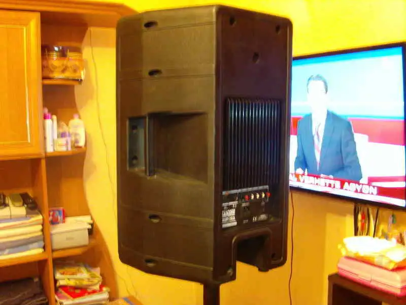 95Db. Két Db . kihúzható hangfal állvánnyal . Magában is alkalmas hangosításra mély nélkül is.