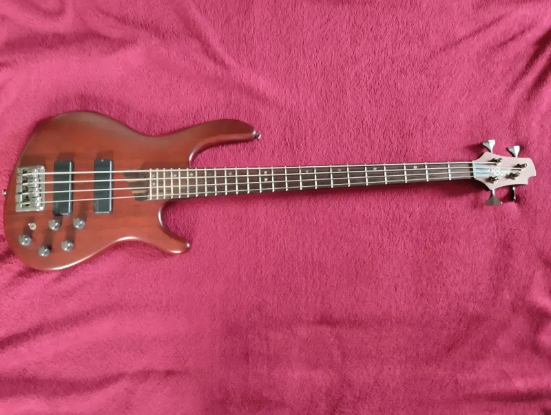 Cort B4 Plus MH, mahagóni test, ötrészes panga panga-dió nyak, Bartolini Mk I pick up, Bartolini elektronika, Hipshot hangolókulcsok. Használt de újszerű állapotban.Kapcsolódó hangszerteszt