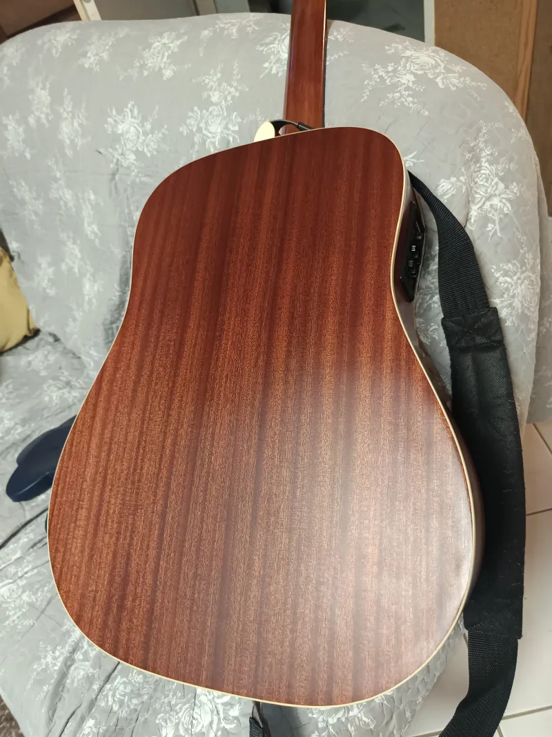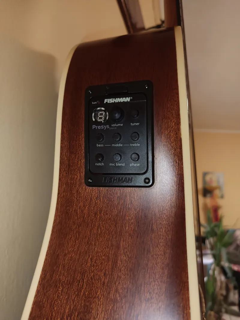 Klasszikus anyagokból készül, szilárd lucfenyő felső lap, mahagóni hátlap és varratok, Ovangkol fogólap. Nemrég járt hangszerésznél (a kulcsok lettek kicserélve a gombok elöregedése miatt).
