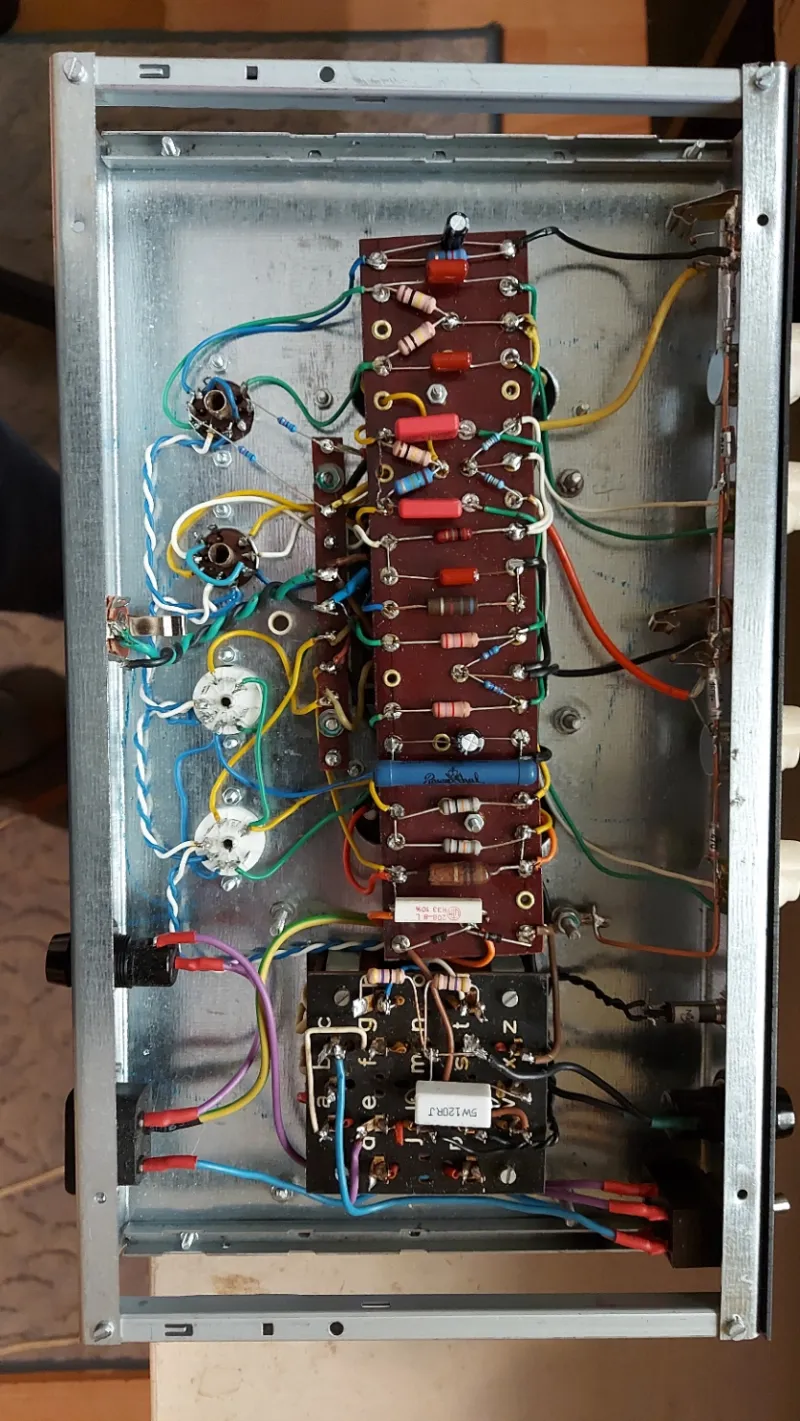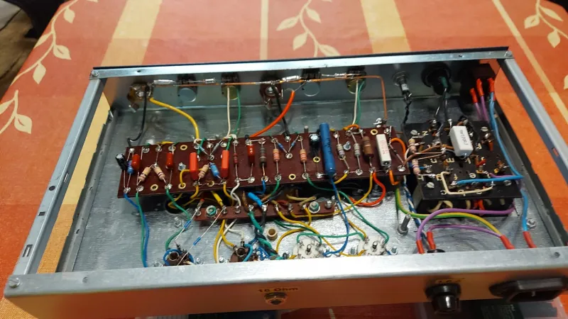 A Marshall 1917 20 Watt P.A. erősítőnek a kapcsolásirajza alapján egyedileg, forléces szereléssel, kézi huzalozással /ponttól -pontig/ elkészített és gondosan bemért másolata,gyári kombó dobozban, az AE 782/A csöves erősítő trafóival, a VOX GSH-1230 hangszóróval, orosz új katonai csövekkel /6N2P-EV az előfokban és párba válogatott 6P14P-E a végfokban/. Szép tiszta rock sound zajmentesen, meglepő dinamikával. Személyes meghallgatását javaslom, de bizalom esetén postázom.(48x39x21-23 cm)