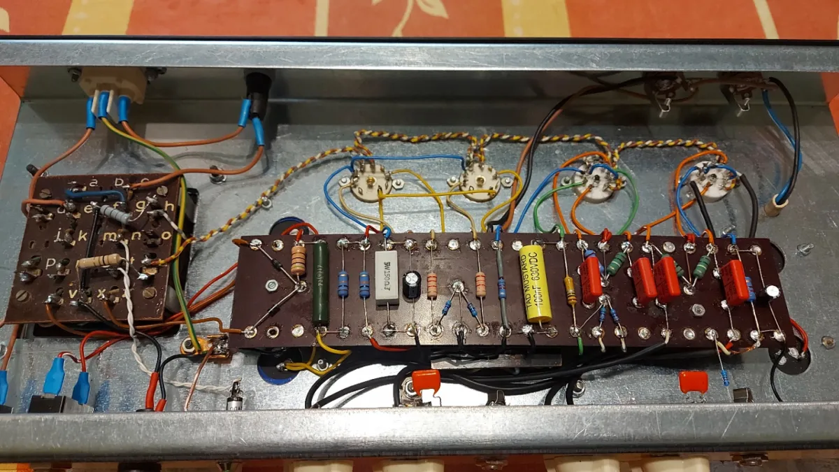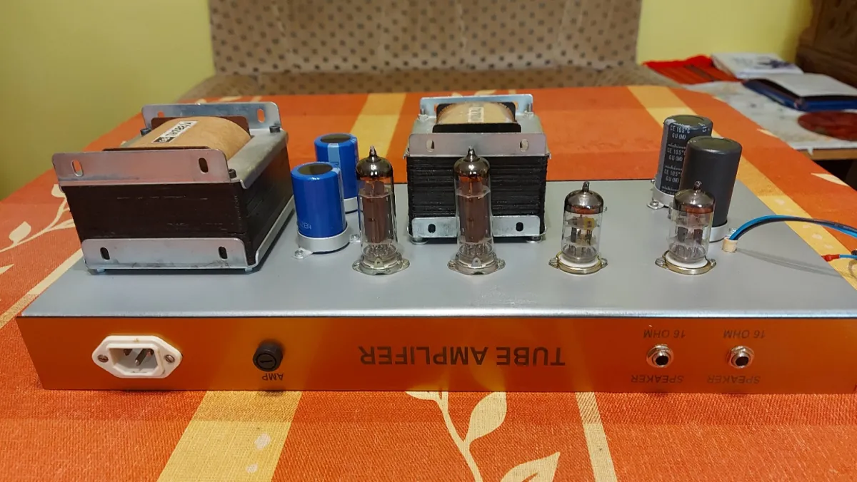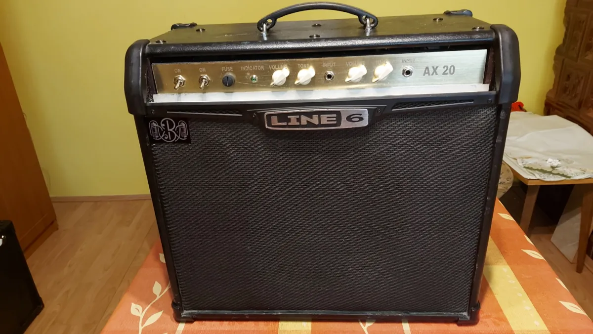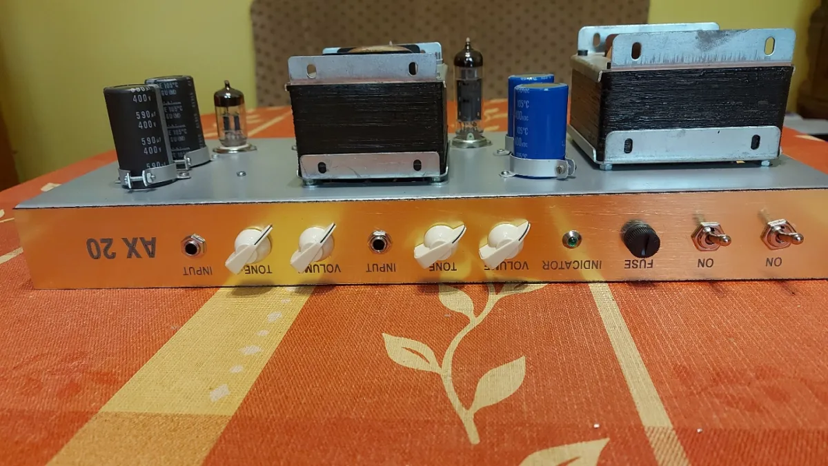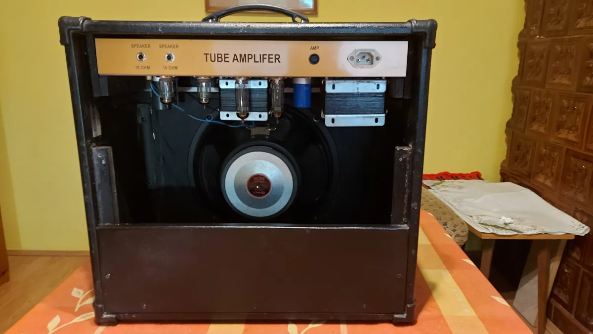 A Marshall 1917 20 Watt P.A. erősítőnek a kapcsolási rajza alapján, egyedileg, forléces szereléssel, kézi huzalozással, /ponttól-pontig/ elkészített és gondosan bemért másolata Line 6 kombó dobozában 12˝ Celestion hangszóróval, RFT ECC83 előfok csövekkel és párba válogatott új 6P14P-E= EL84 végcsövekkel, az AE 782!A csöves erősítő gyári trafóival, új alkatrészekkel. Szép, tiszta rock sound, zajmentesen, - a nagyon jó Marshall kapcsolásnak köszönhetően, hihetetlen dinamikával.