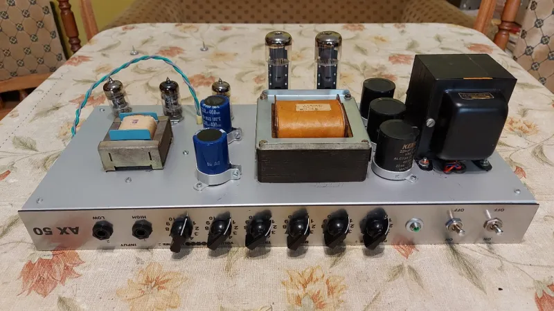 A Marshall 1987 (Plexi) erősítőnek a kapcsolási rajza alapján, egyedileg, forléces szereléssel, kézi huzalozással, /ponttól-pontig/ elkészített és gondosan bemért másolata, gyári kombó dobozban, Fane 12˝-os 80 W-os hangszóróval. Új, csak beüzemelve volt. Gyári trafók, új alkatrészek (3x Marshall ECC83, 2x párba válogatott RFT EL34, - Biasolhatóan). Szép, tiszta rock sound zajmentesen, igen nagy dinamikával.Személyes meghallgatását javaslom, de bizalom esetén postázom.