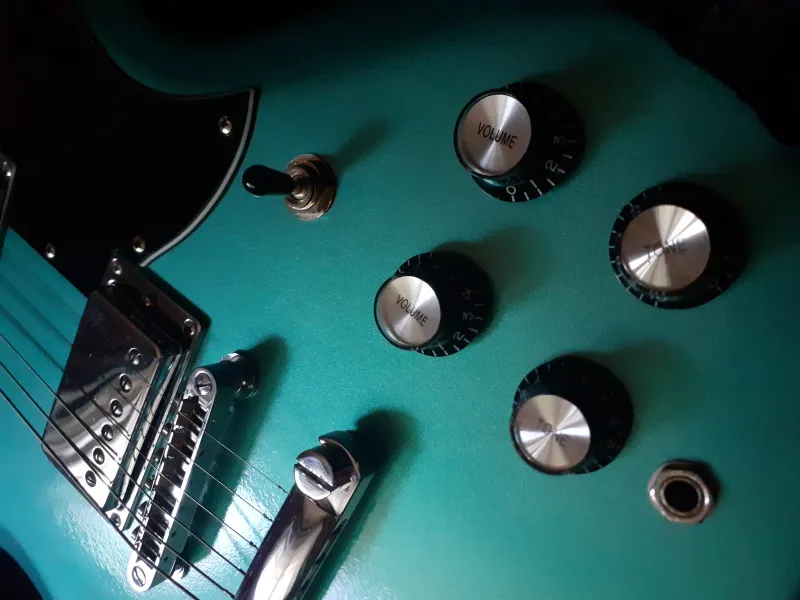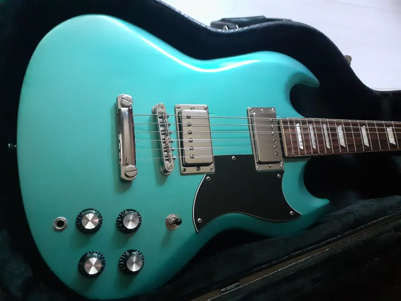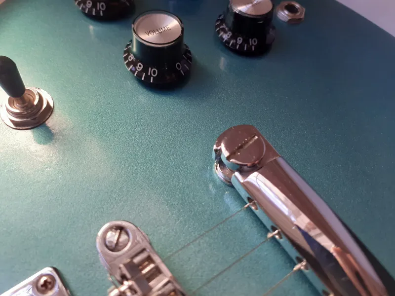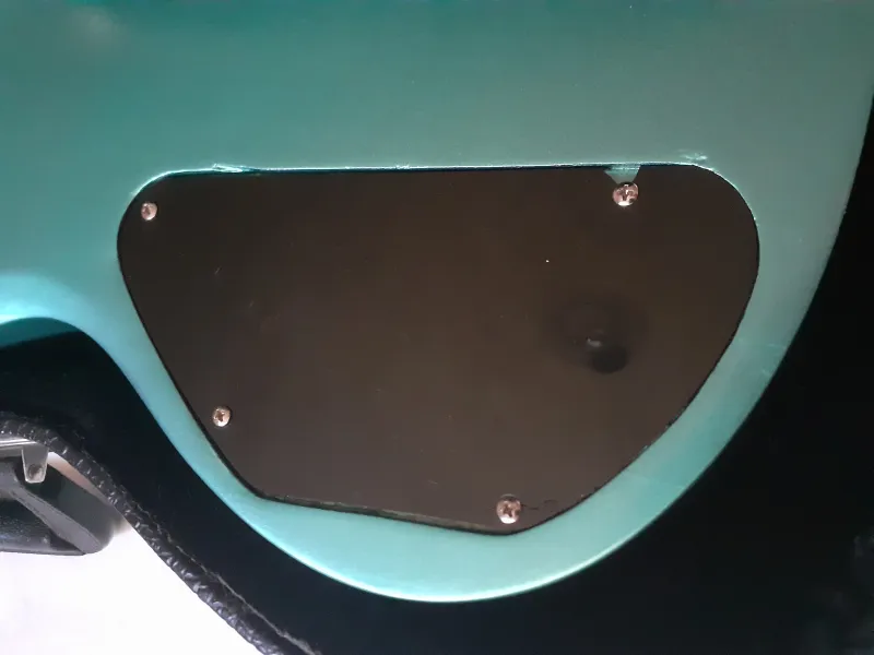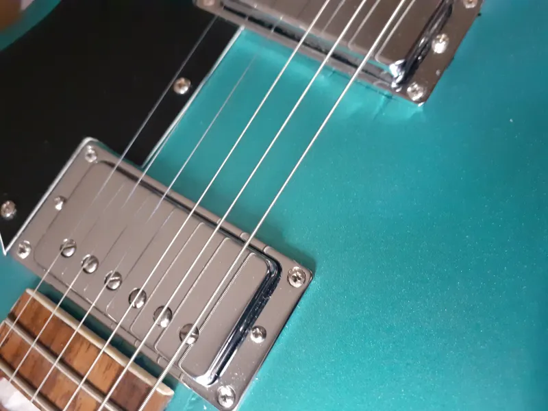 Harley Benton alap újrafestve. Brutál jó Teal Green metál szín (Nitorlack, a Fender hivatalos fényező brand-je). A képek sajnos nem hozzák ki a metál hatást.