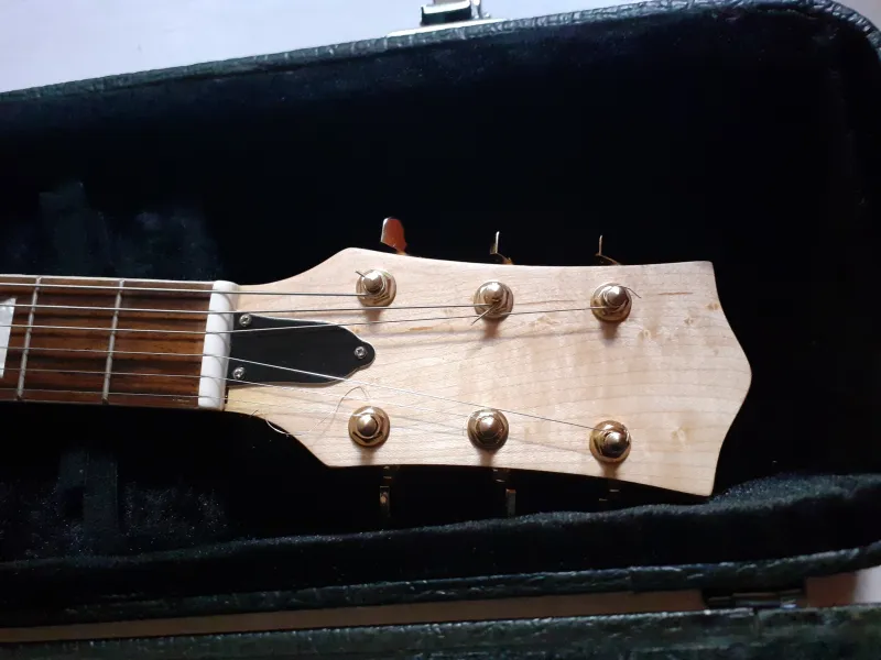 Néhány apró karc van rajta. Nagyon kényelmes és jól játszható nyak, a fogólap Dunlop 2-es kondícionálóval leápolva. Kényelmes, alacsony húrnyomásra állítva.