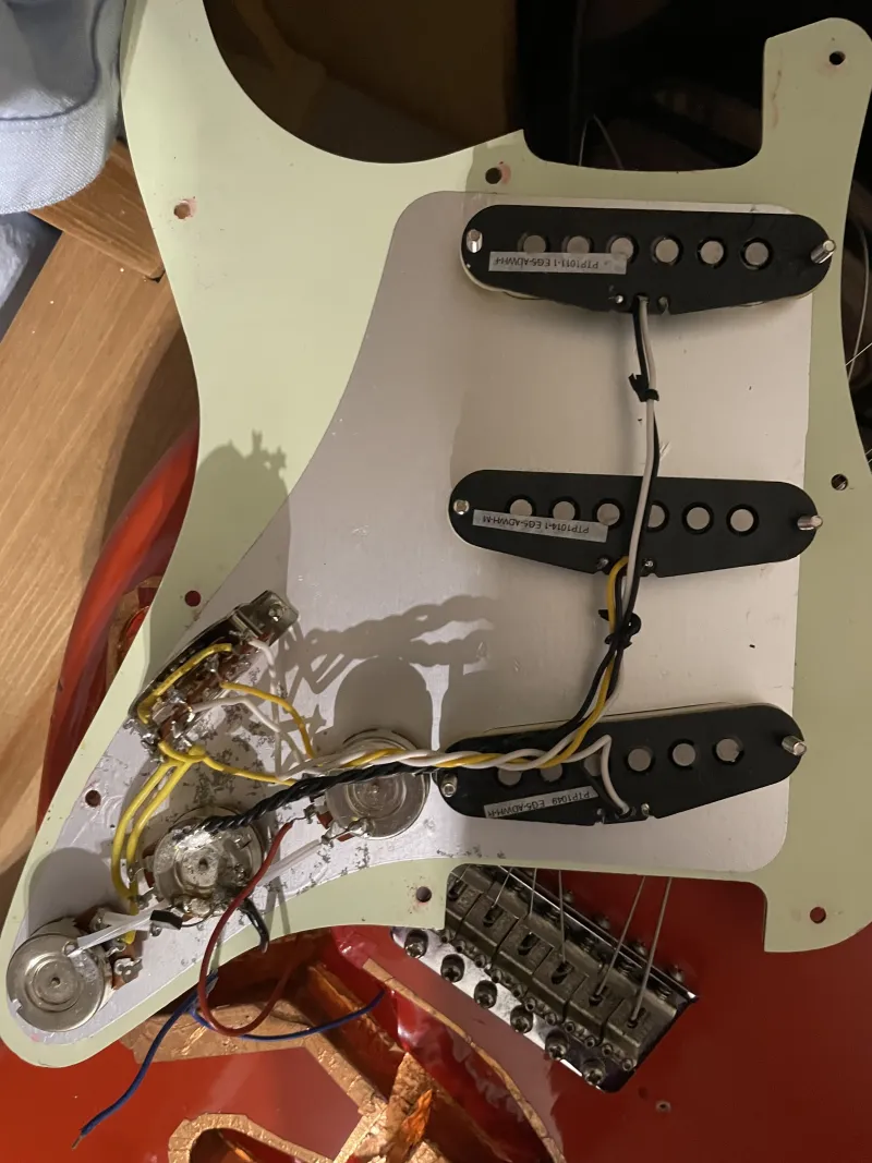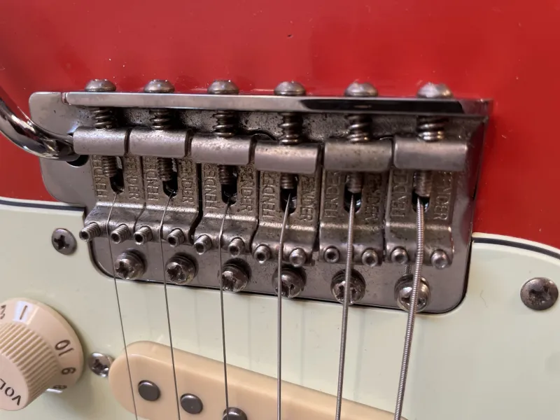 Kiváló anyagokból , alkatrészekből összerakott roadworn kinézetű , relicelt strat eladó .Matt fiesta red , F vastagságú test , réz fóliázva .