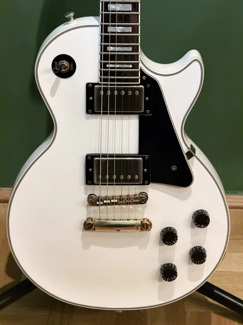 Kifogástalan, karcmentes állapotban lévő Epiphone Les Paul Custom PRO elektromos gitár, Alpine White színben.A hangszer 2019-es vásárlás, kizárólag otthoni, füstmentes stúdiókörnyezetben volt használva.