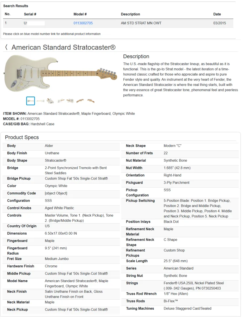 Eredeti tokkal-vonóval. A Fender szériaszám keresője szerint 2015-ös, de a nyakon és nyakzseben levő pecsétek, meg nyaklemez szerint egyértelműen 2014-es (valószínűleg összerakták év végén, nyilvántartásba vették következő évben).