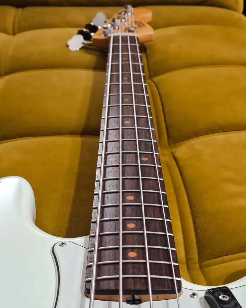 Eladó egy 2013-as Fender American Vintage `63 Precision Bass Olympic White színben, kiváló állapotban. Ez a modell a nagyra értékelt American Vintage szériából (2012-2017) származik, amely vintage-korhű specifikációiról és nitro lakkozásáról ismert.