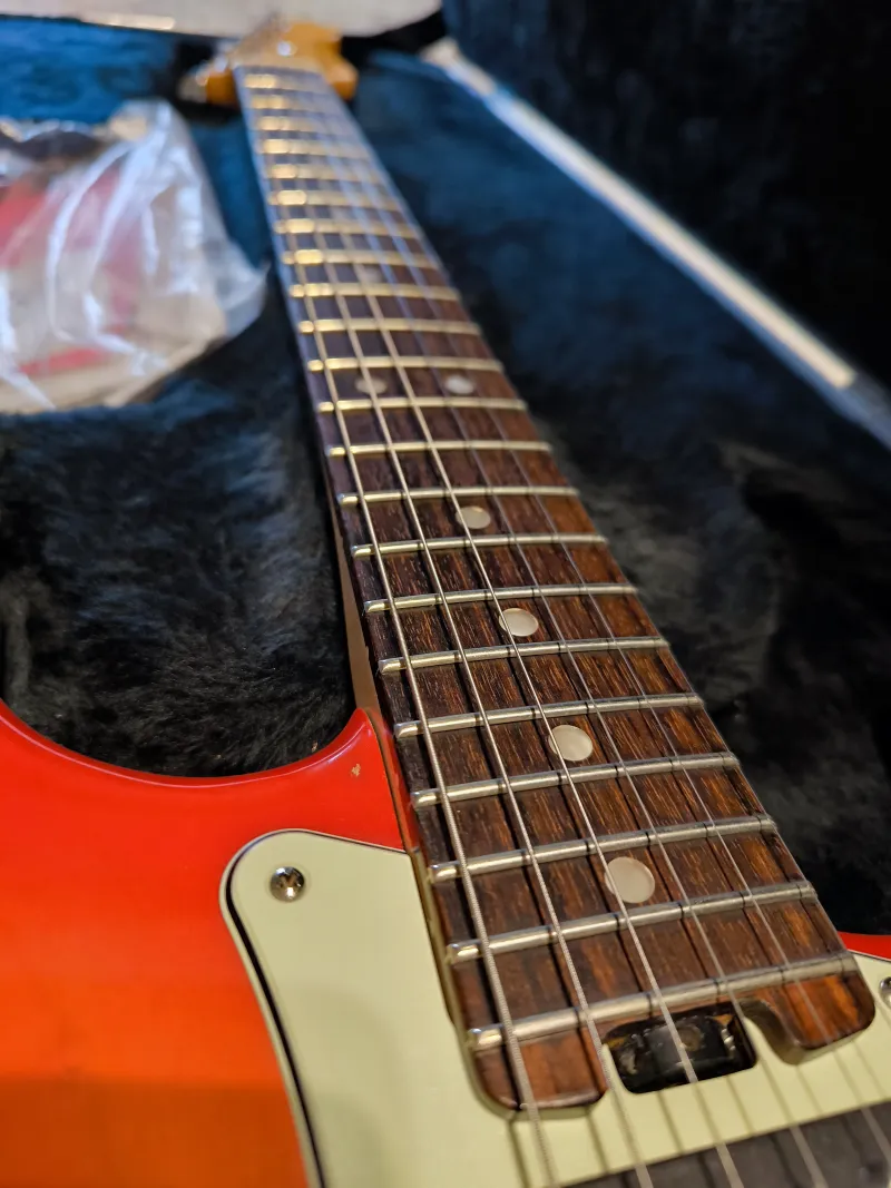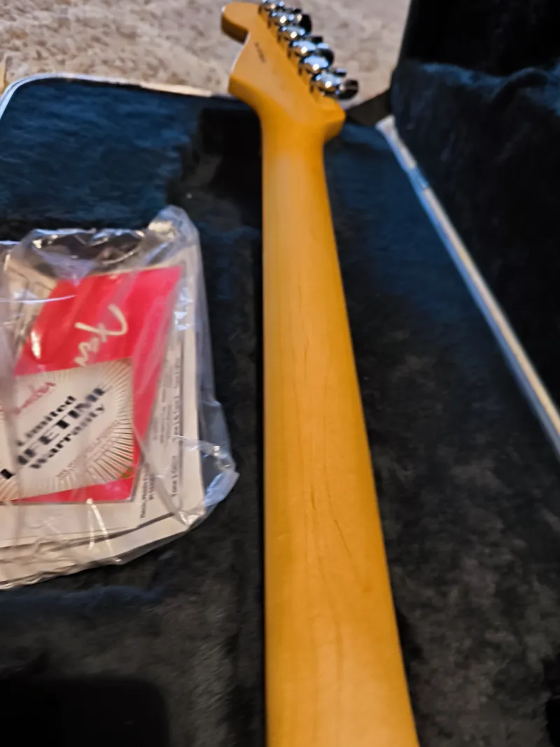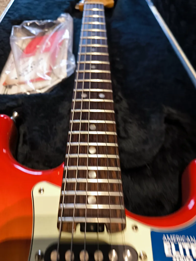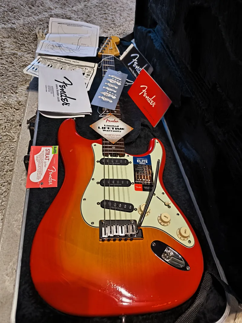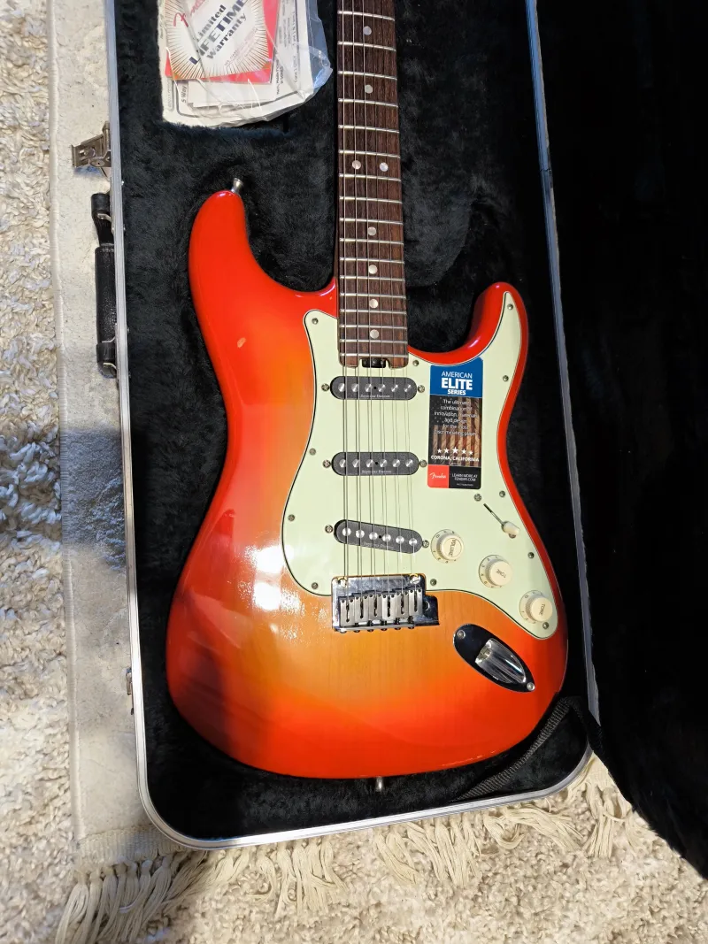 Professzionális, USA gyártású Elite Stratocaster, Seymour Duncan SSL-4 Quarter Pound single-coil pickup szettel (high output, rock/blues hangzás). Modern compound radius juhar nyakkal, gyors “C-to-D˝ profil, 22 medium jumbo érintő, 2-pontos tremoló print pop-in karral, locking kulcsokkal. Használatból eredő, kis esztétikai kopások - érintők és nyak tökéletesek, tremolo, elektronika hibátlanul működik. A gitár nagyon sok hangszínt tud produkálni, hála az elit elektronikának. Prémium új húrokkal várja új gazdáját.Professzionális hangszer, stúdióra és színpadra egyaránt alkalmas. Testes, karakteres SSL-4 hang - klasszikus Strat hang, modern erővel .Fender keménytokkal.