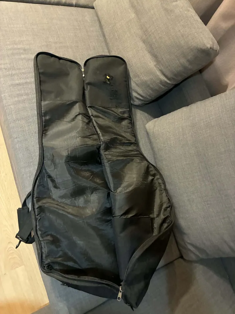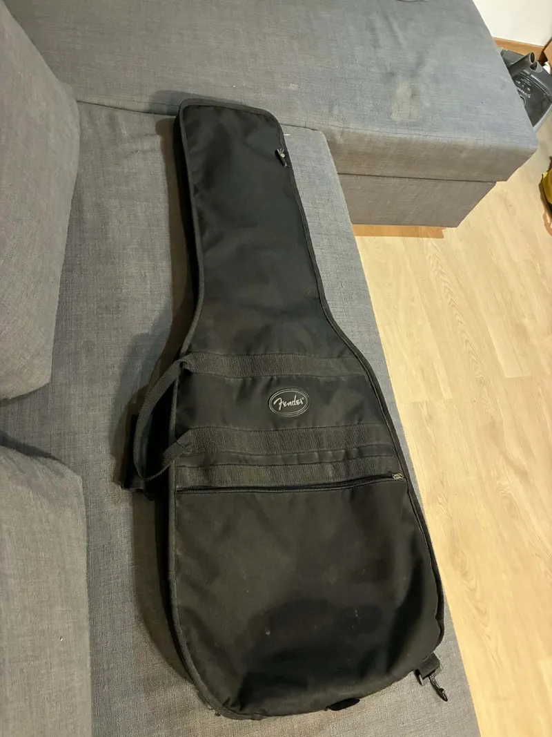 Fender puhatok a képeken látható állapotban.A gitárfejénél a húrok a szokásos helyen kikezdték az anyagot, de ezt leszámítva hibátlan, cipzárak rendben.