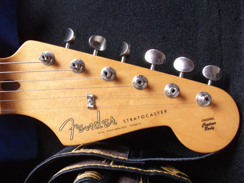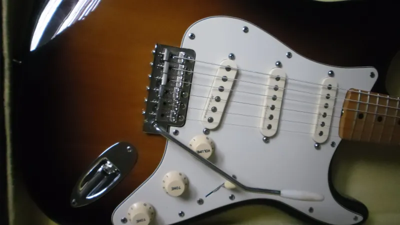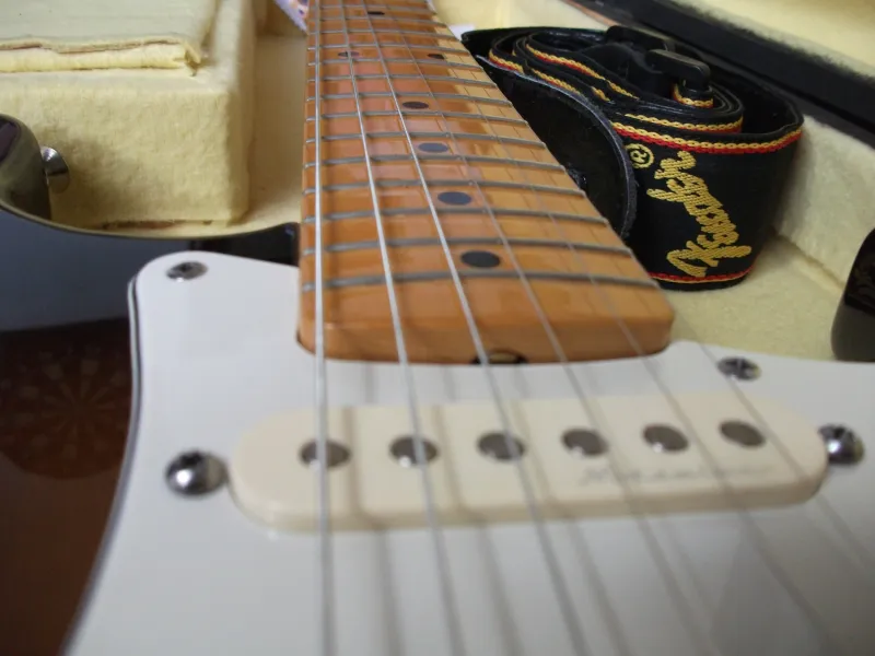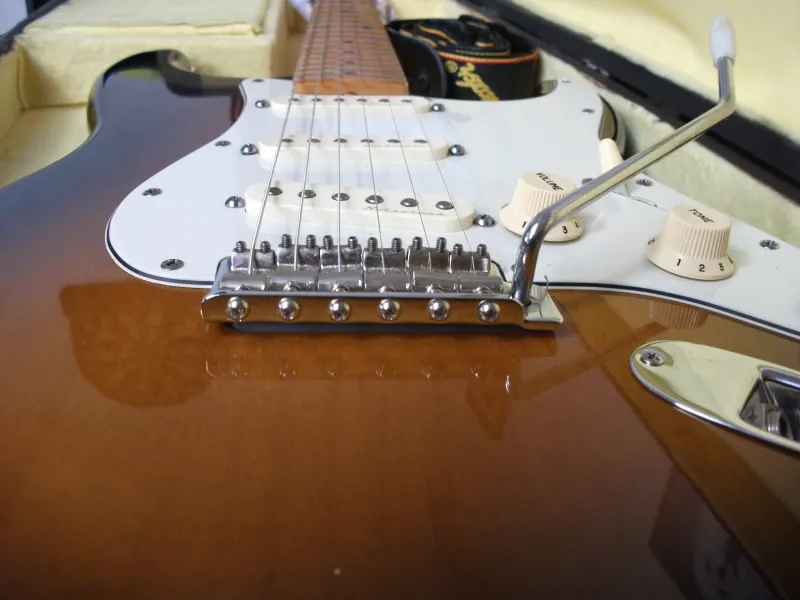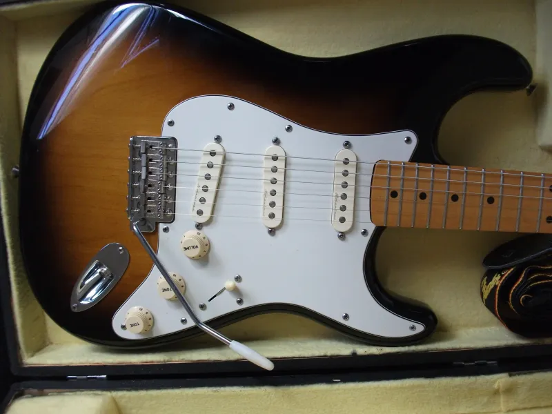 Fender Stratocaster MN 2-Tone Sunburst, égerfa test, juhar nyak, ˝C˝ profil, menzúra: 25.5˝ (64.8 cm), juhar fogólap. Minden eredeti rajta kivéve a 3 hangszedők