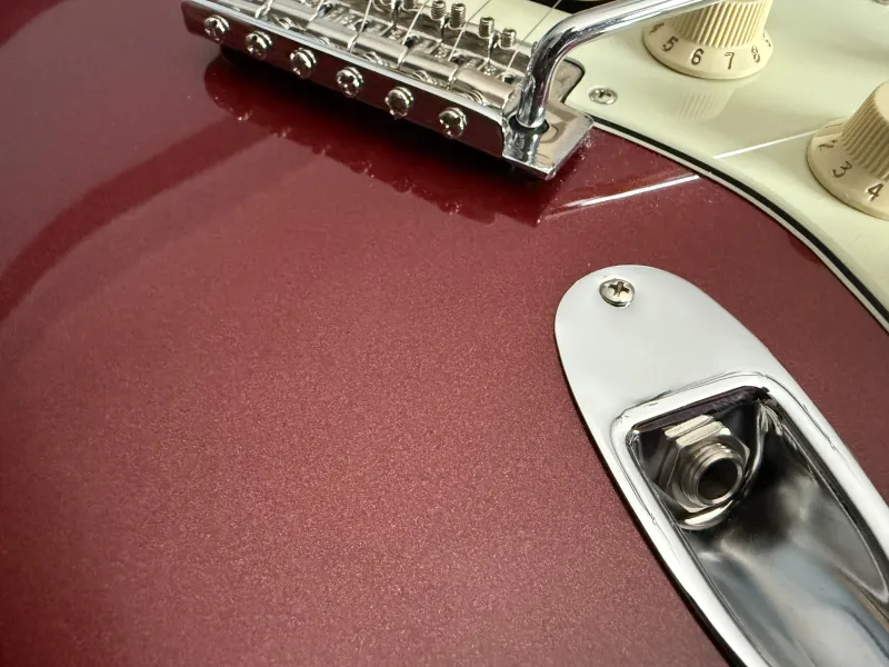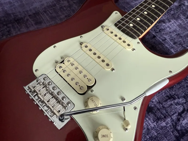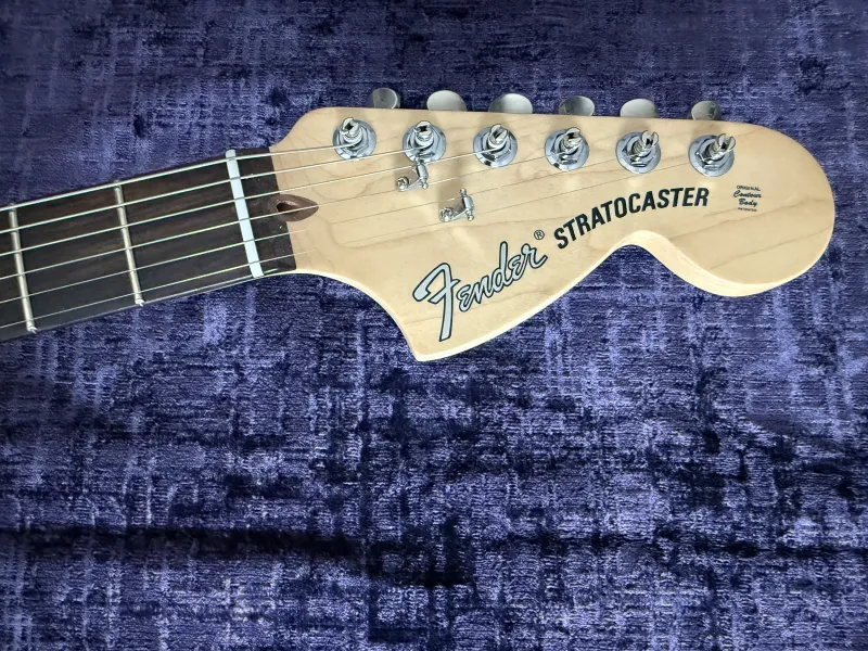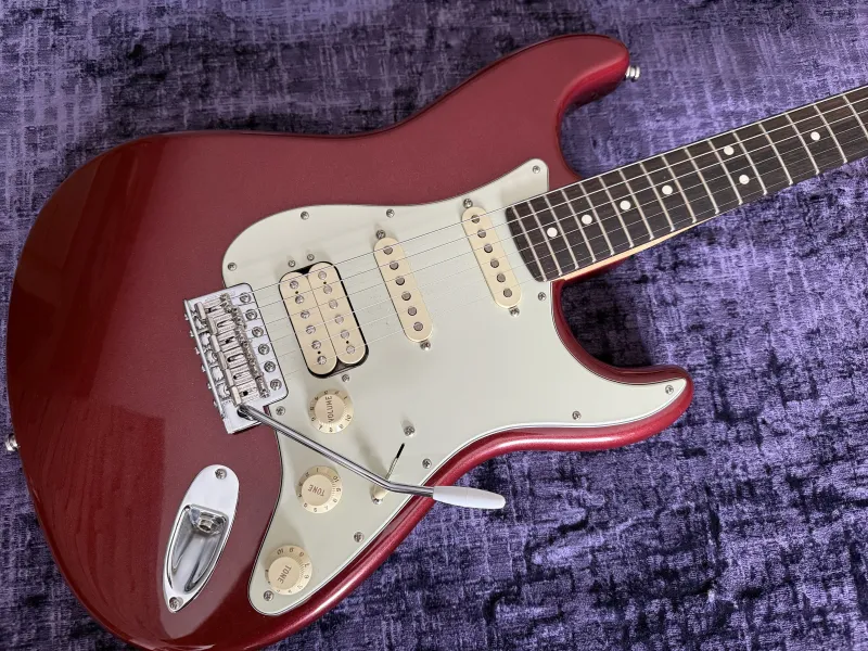 HSS kiosztás, Yosemite pickupok, híd gyárilag felezhető. Modern C nyakprofil, jumbo bundok, Elixir húrokkal, gyári Fender puhatokkal, a gyári, szar betekerős helyett, bepattintós, imbusszal szabályozható karfeszességű Wilkinson tremolóval upgradelve.
