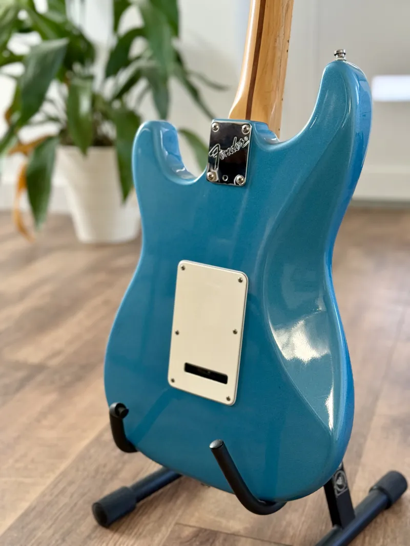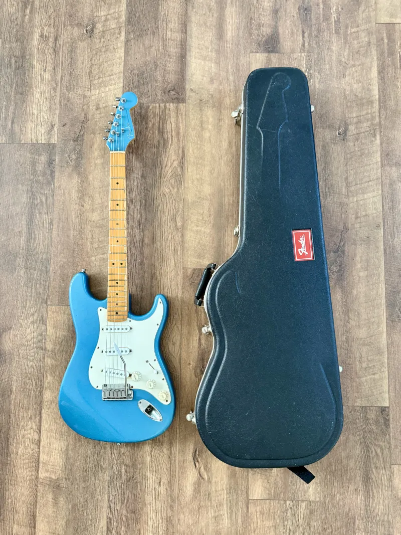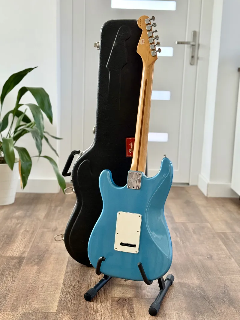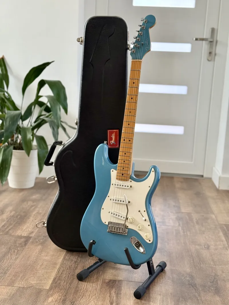 NINCS CSERE, CSAK KP!! Gyönyörű állapotban 30 éves USA Fender Stratocaster gitárom 95 vége - 96 elejéből, gyári keménytokjában. Matching headstock, mondani sem kell, hogy brutális sound, tremolo is remekül tartja a hangolást 😊 Bundok is remek állapotban vannak, évekig a tokjában ült érintetlenül. 😊Ezt a limited edition-t azonos színű fejjel 1995-1996 között gyártották egy rövid ideig Sonic Blue (amilyen ez is), surf green (zöld) és Fiesta red (piros) színben, mindegyikből 100-300 db-ot gyártott a Fender. Ez az egyike annak a 100-300 db. -nak, ami az egész világon van..