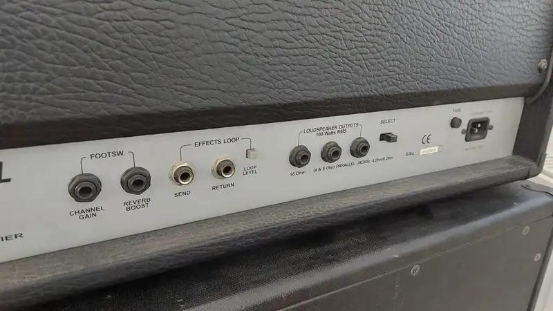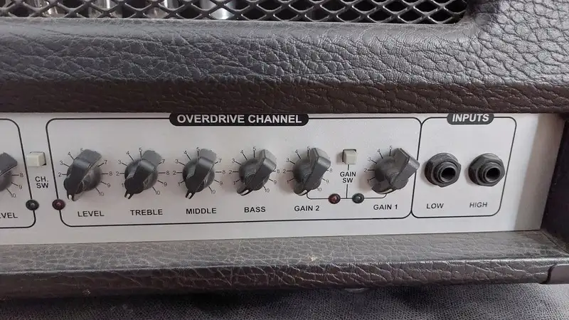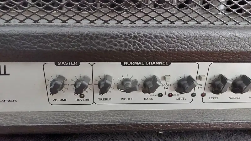A fej 100W full cső, 2 külön EQ-s csatorna, a tiszta csatornán boost, a torz csatin pedig 2 féle gain.