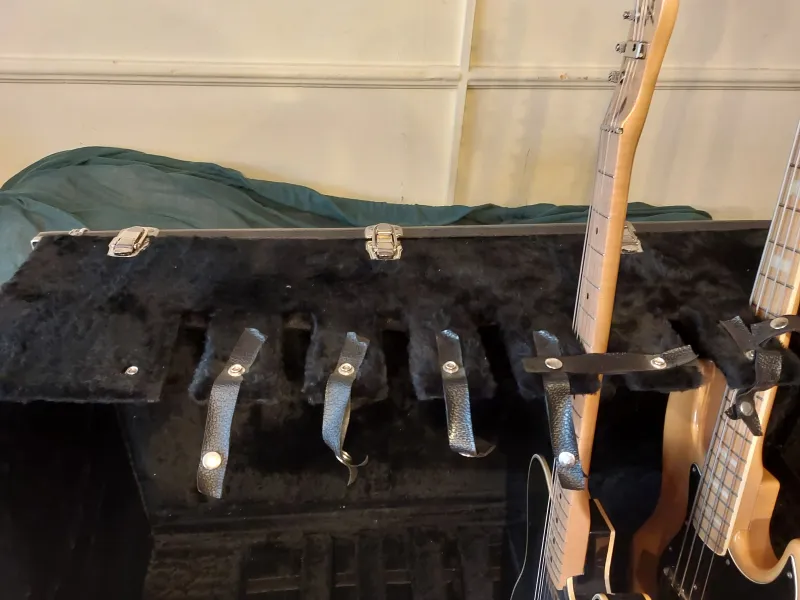 Az előlapon jól látható az FX CASES ovális fém logó. Kemény falú, tolex jellegű külső, belül vastag fekete plüss/bársony bélés. Felül bőr szíjak/fülek, amik a gitárnyakakat tartják. Alul hornyolt, párnázott fészkek a gitártesteknek. Összecsukható kialakítás: a felső nyaktartó rész összecsukható, a szállításkor zárt láda. Oldalt és elöl pillangózárak, masszív turné-hardver. Ez nem sima állvány: színpadi gitárrack (koncerten kinyitod, és 6 gitár állhat benne). A fekete bársony bélés miatt attraktív megjelenésű és a gitár fizikai védelmét is kitűnően szolgálja. Színpadon, stúdióban, próbahelyiségben tökéletes megoldás, de otthoni használatra is ajánlom. A 2000-es évek elején gyártott, abban az időben sokak által használt, fél-custom jellegű kiegészítő volt. Több mint 20 éve saját tokjában várja új gazdáját. 120 darabos gitárgyűjteményem egyik kiegészítője lett volna, dekoratív kiállításra szántam, de végül nem volt rá szükség.Személyes átvétel, vidéki pályaudvarra ingyenesen elviszem.