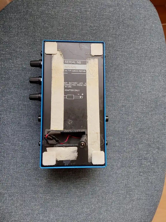 Az elemtartó fedél letört, de van hozzá egy átalakító, amivel az eredeti nem szabványos táp csatlakozója kiváltható, és így már akármelyik ma is kapható pedál táppal működik.