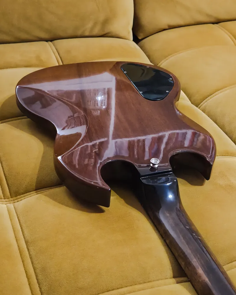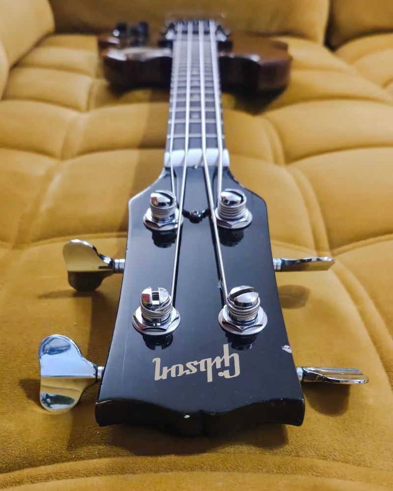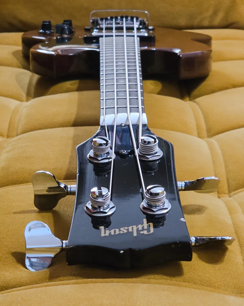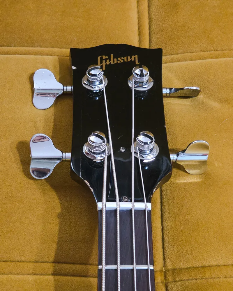 A francia tulajdonos egy időben DiMarzio Model One pickupot szerelt bele, valamint egy kapcsolót. Azóta sikerült beszereznem az eredeti Gibson pickupokat, és visszaállítottam a basszust közelebb az eredeti állapotához. A módosításból egyetlen apró furat maradt a potméterek között, ami a hangszer történetének része. A pickupválasztó kapcsoló alól hiányzik a ˝számlap˝.