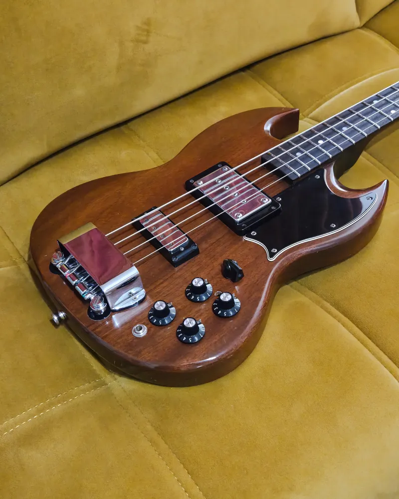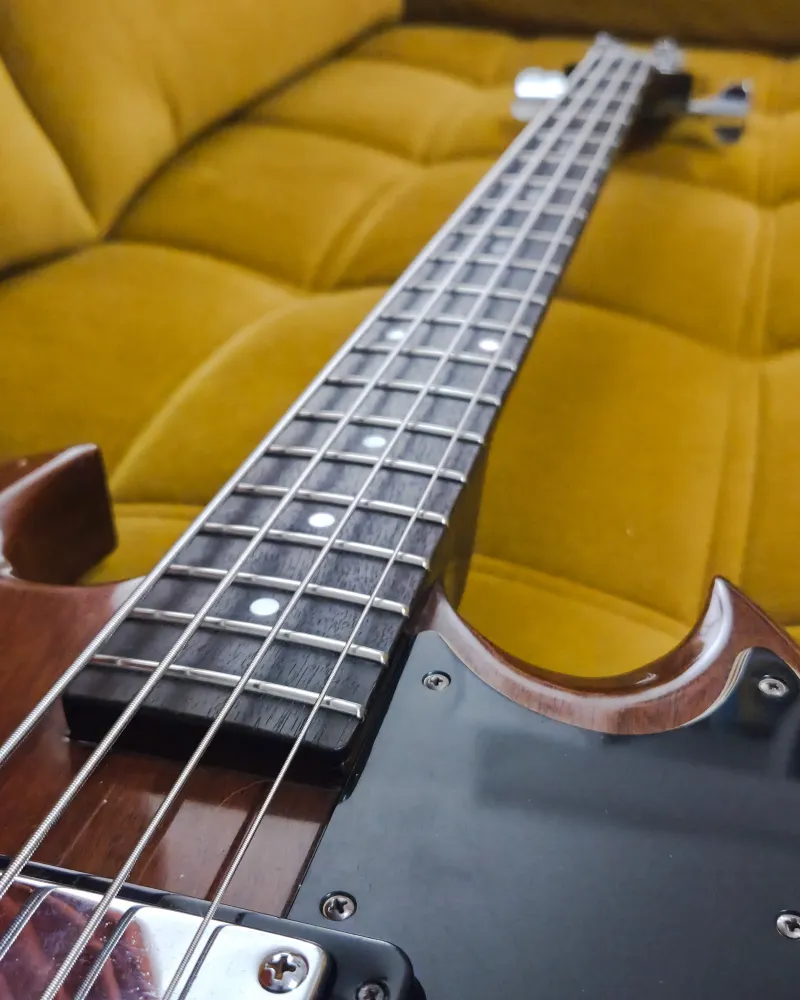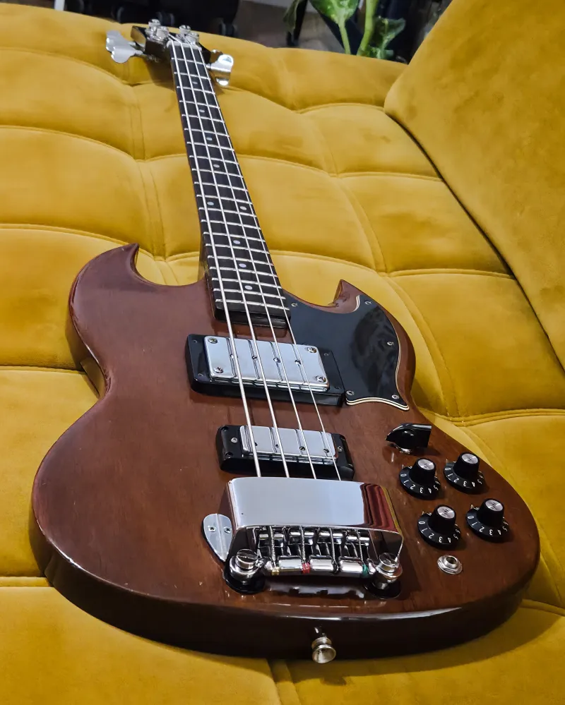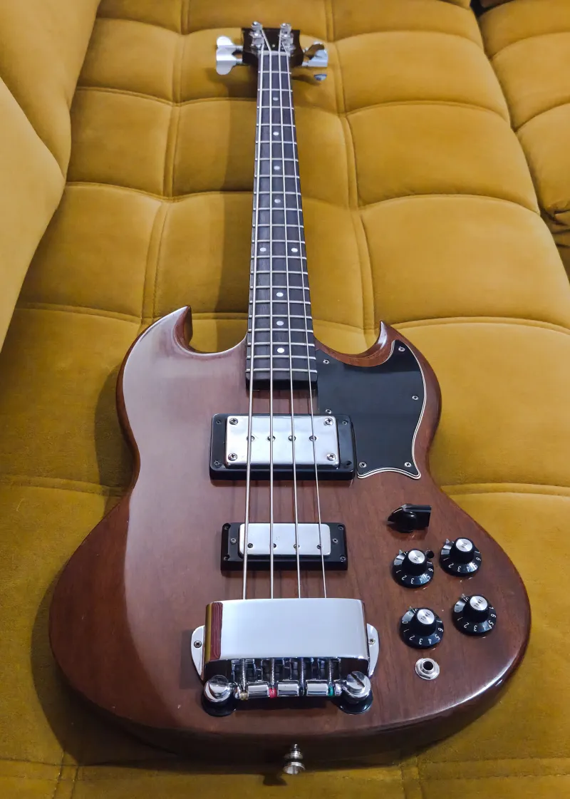 Eladó egy 1974-es Gibson EB-3L, a Gibson ikonikus SG-formájú basszusgitárjának hosszú menzúrás változata.