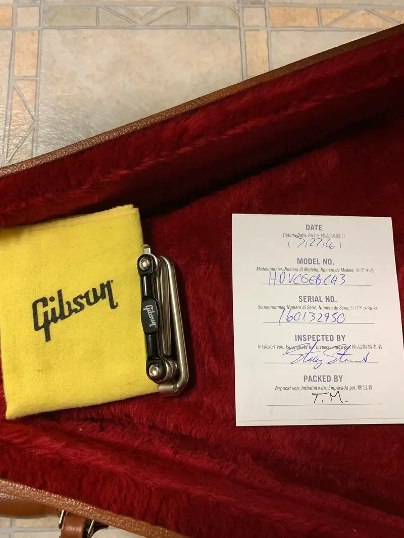 Szép állapotban, fotózott felületi hibával. Hídnál Seymour Duncan SH4, nyaknál eredeti Gibson 57 hangszedő. G-Force hangoló helyett Planet Waves auto trim satus kulcsok. Planet Waves strap lock, Gibson heveder, Gibson szerszám. Gyári kemény formatok, papír. A hátsó hevedertartó áthelyezve, így nem fejnehéz.