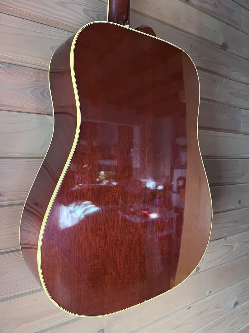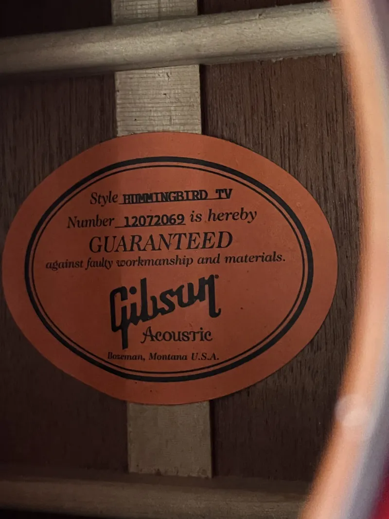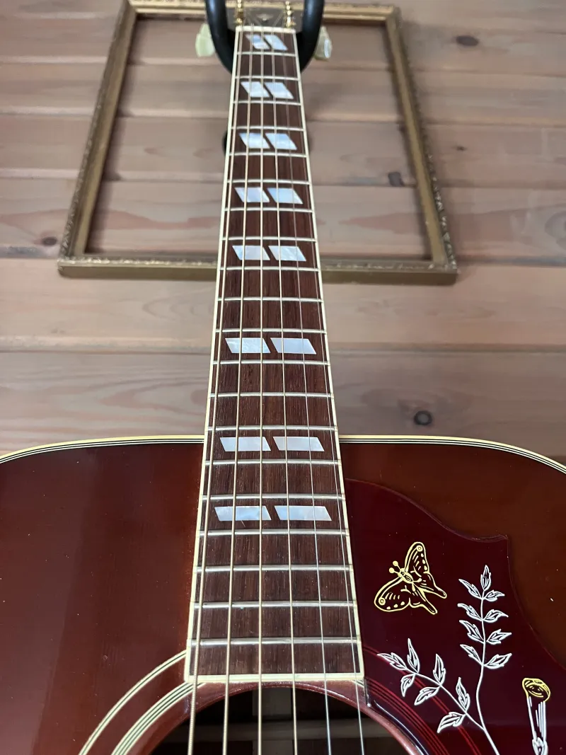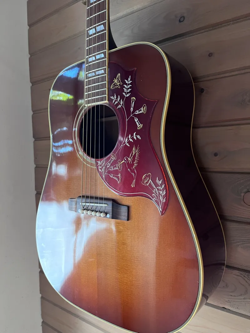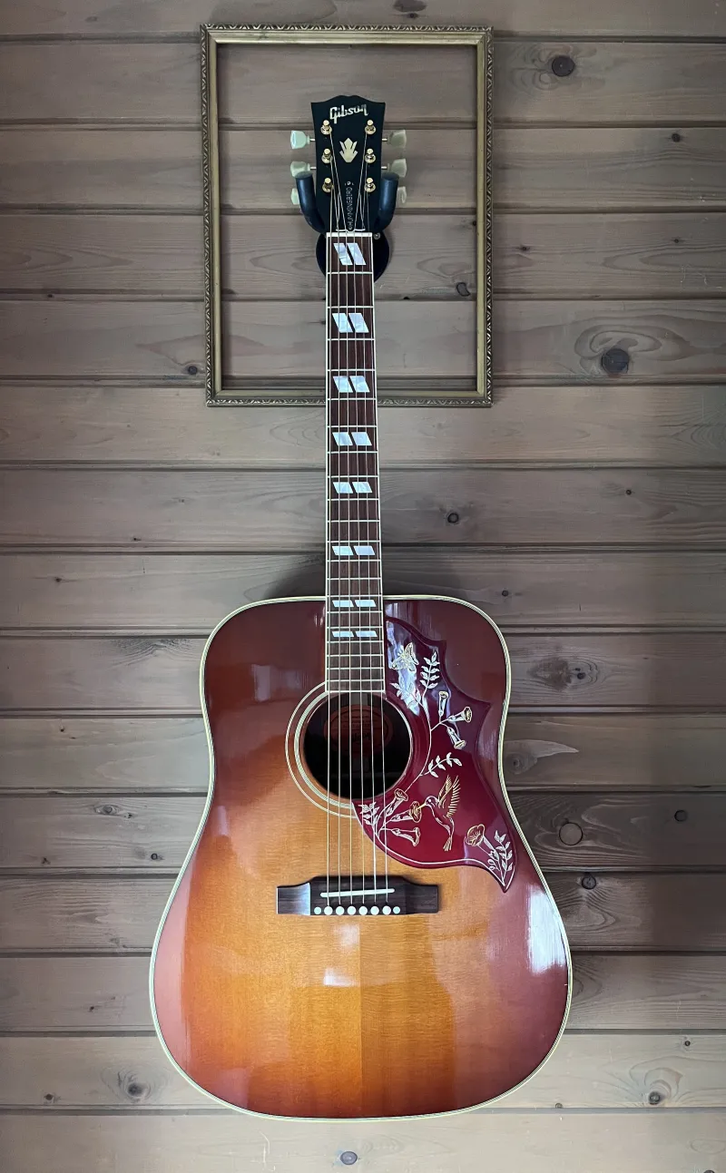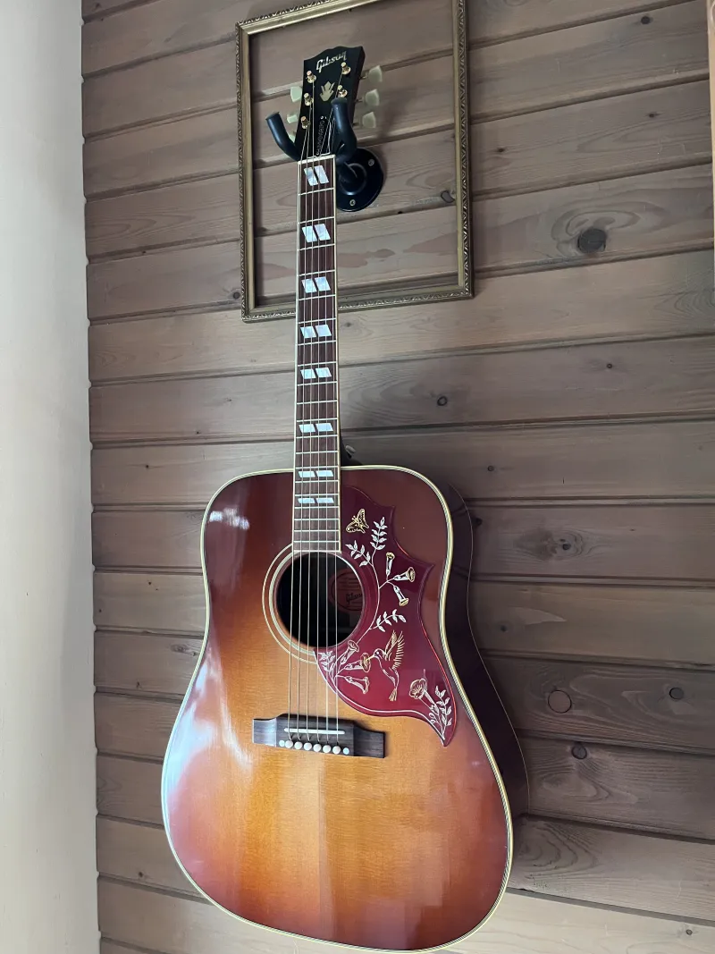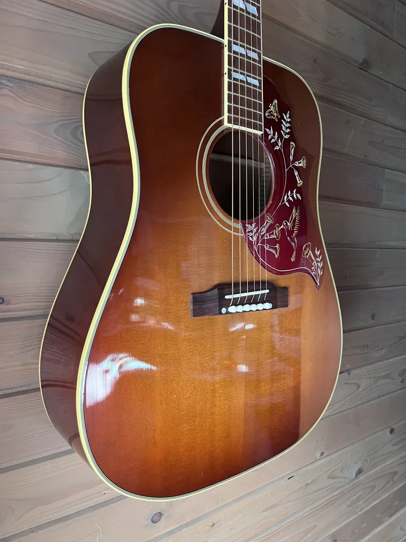 Szép állapotú, ikonikus Gibson Hummingbird a True Vintage sorozatból 2012-ből Cherry Sunburst színben. Sitka fenyő fedlap, mahagóni oldalak és hát. Hide glue! A fogólap és híd madagaszkári rózsafa. Fishman Matrix Infinity aktív elektronika van a hangszerben.