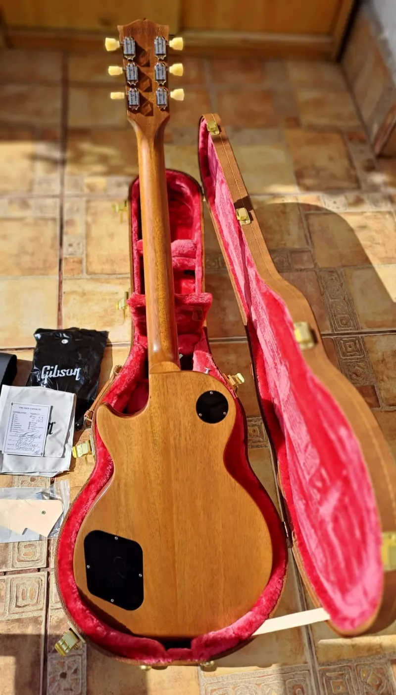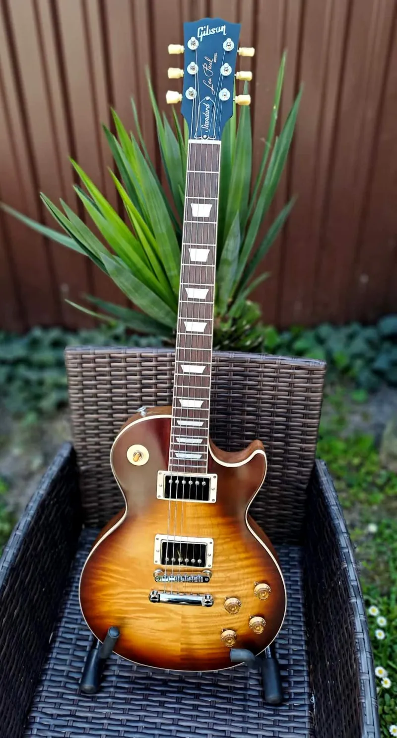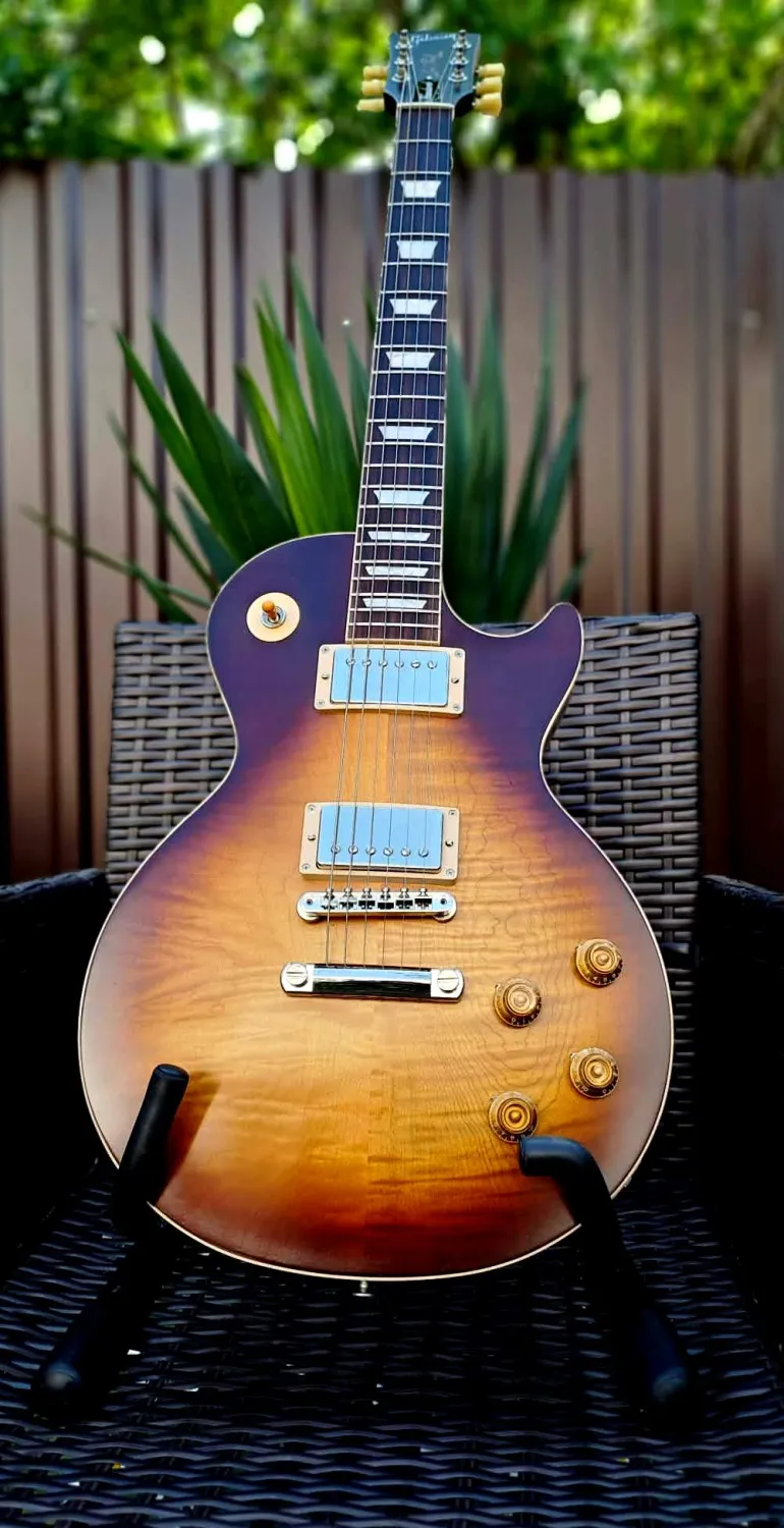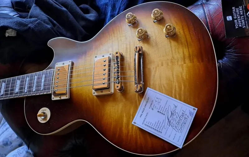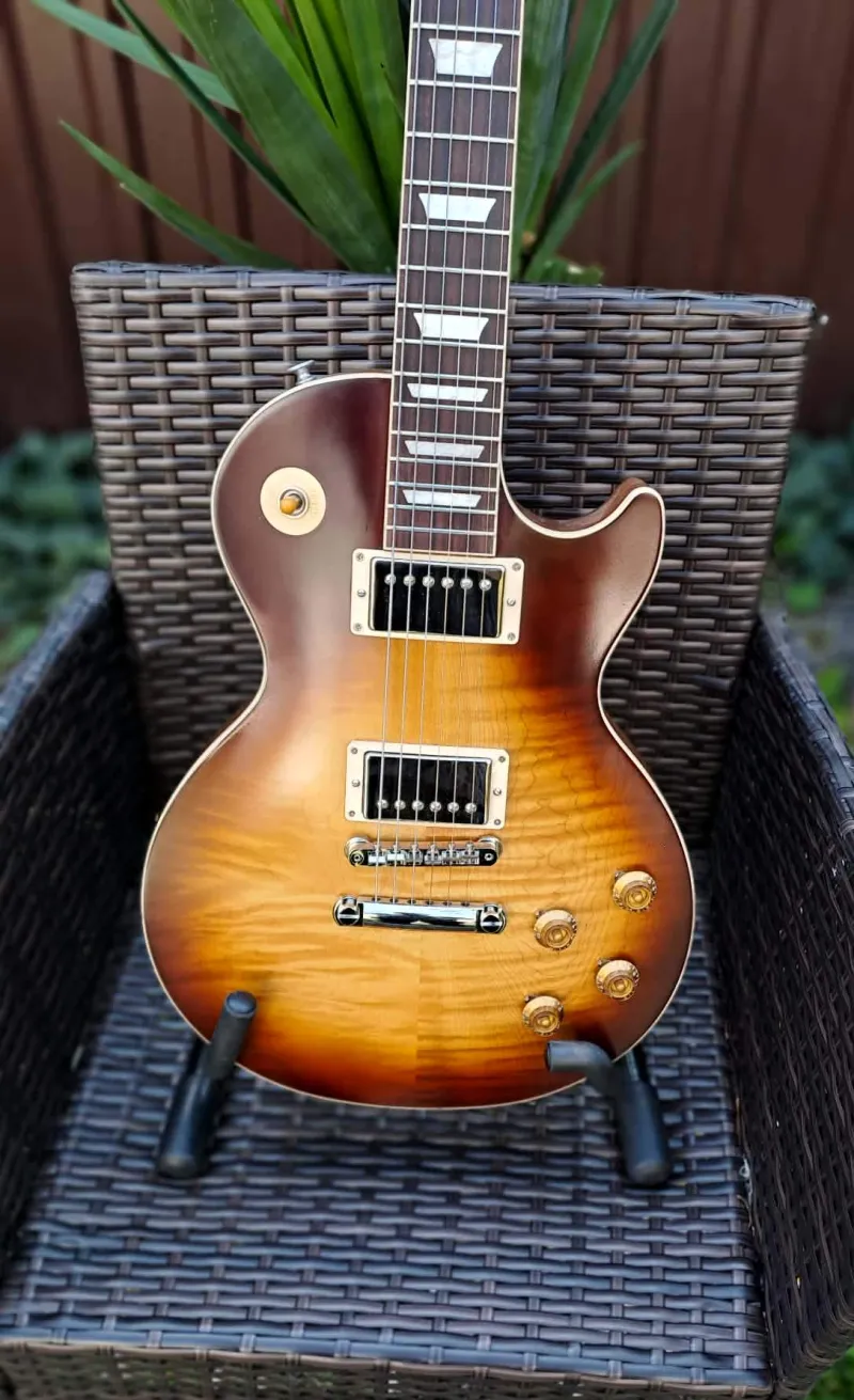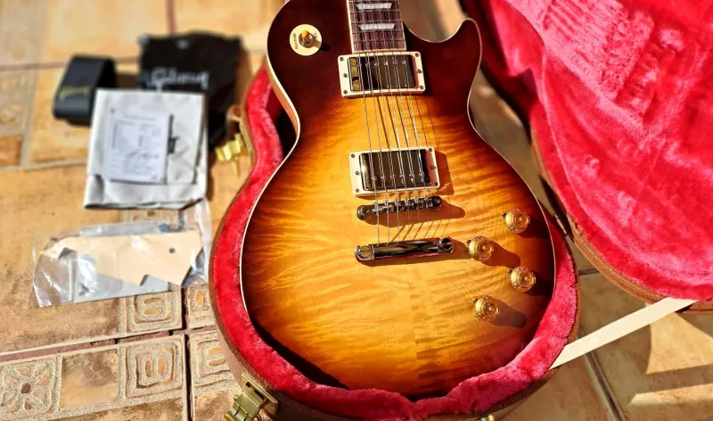 Burutális AA jávor fedlappal készült, ami eszméletlen jól néz ki, szinte minden fényben más! Kényelmes 50s vintage nyakprofillal rendelkezik, gyakorlatilag szinte nulla húrmagassággal! A hangszer Burstbucker 1 és 2 hangszedőknek is köszönhetően még a Gibsonokhoz képest is nagyon harap! Gyári Gibson keménytokkal, és minden tartozékával eladó papírjaival, szíjjal eladó! 3,9 kg!