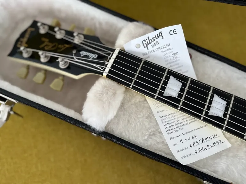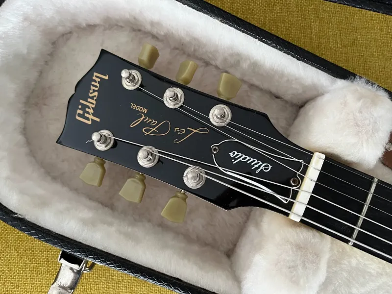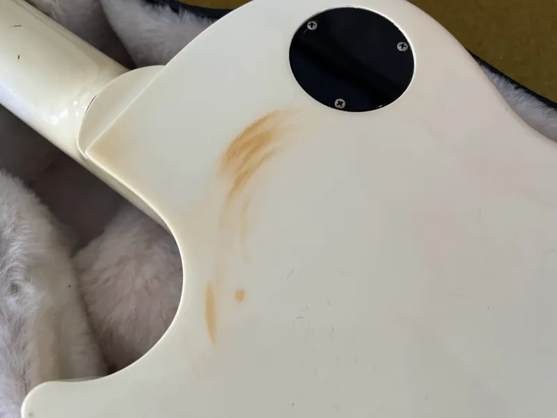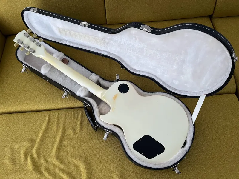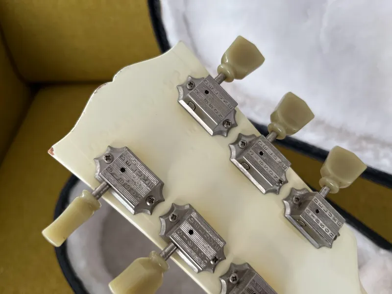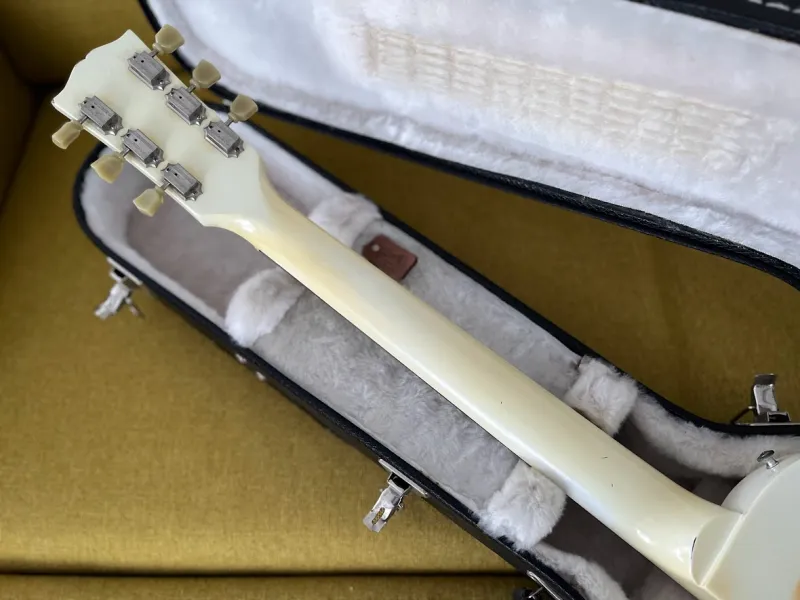 Nem vitrinlakó hangszer, a nitro lakk már gyönyörű sárgulásnak indult, a használat nyomaival az egész gitár természetes ˝relic˝ stílust kapott. A hátán a lakkozásban egy pánt is beégett nyomot hagyott.