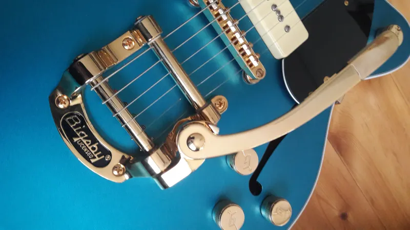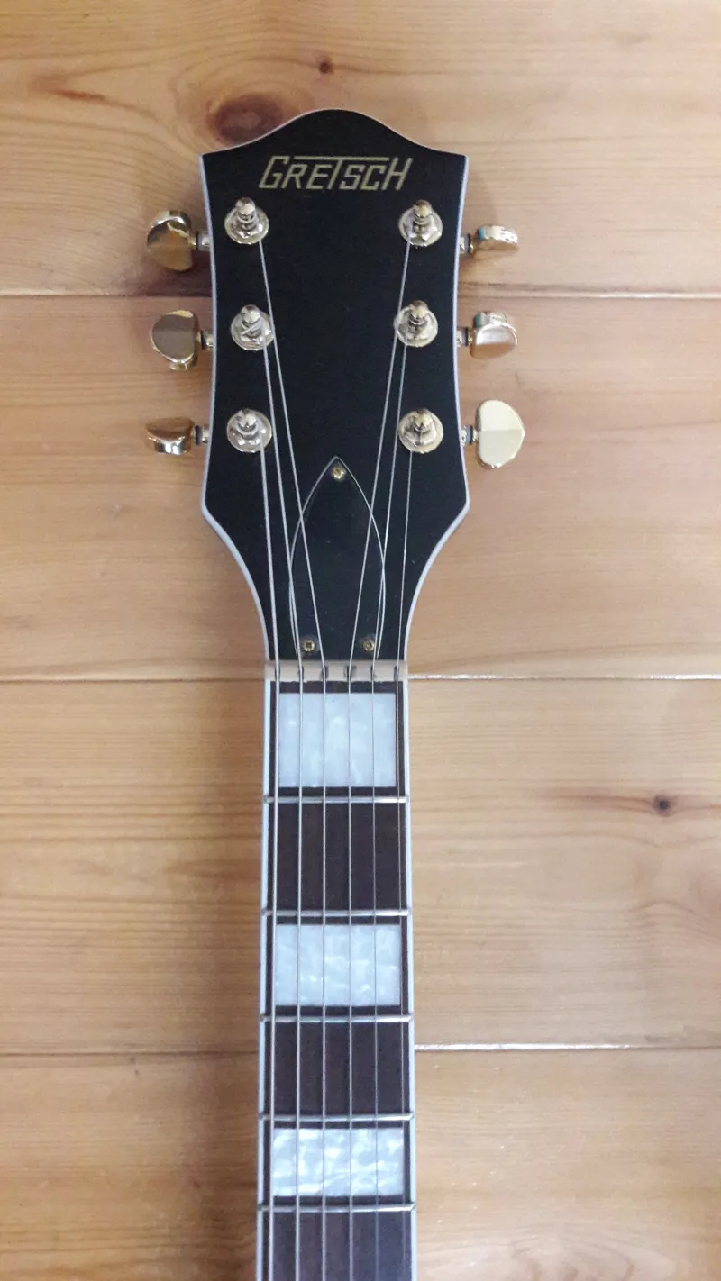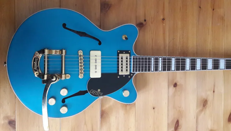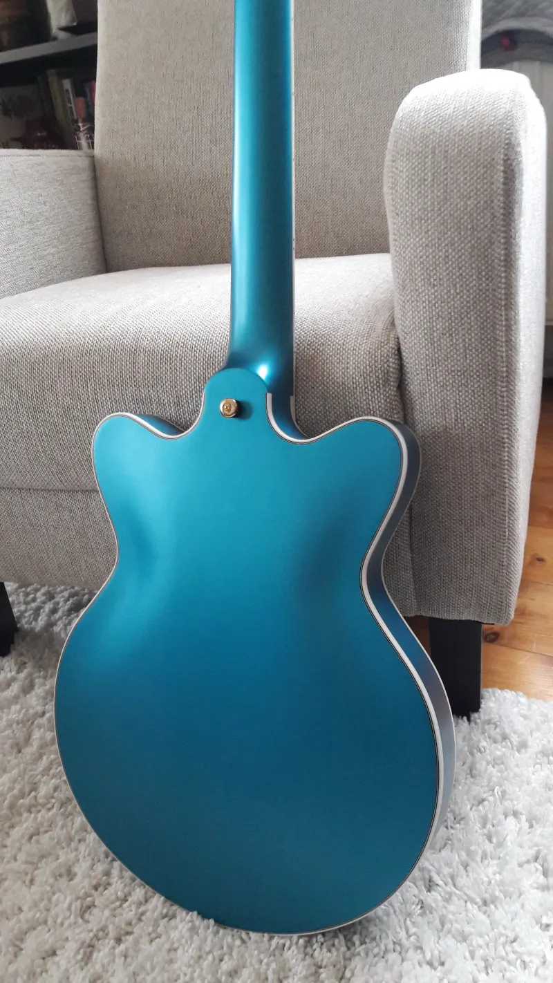 Eladó kifogástalan állapotban lévő Gretsch gitár. Gyönyörű hangszer, de nem az én világom. Limitált szériás gyártás, P90-es hídi pickup-pal, a nyaki PU Filtertron humbucker. A potméter sapkák aranyszínű Gretsch potikra lettek kicserélve a Bigsby kar színéhez igazítva. A képek talán nem adják vissza jól, de az összes hardware aranyszínű a gitáron. Riviera Blue színben, szatén fényezéssel. Új húrokkal felszerelve, azonnal játszható állapotban. Tok sajnos nincsen hozzá.