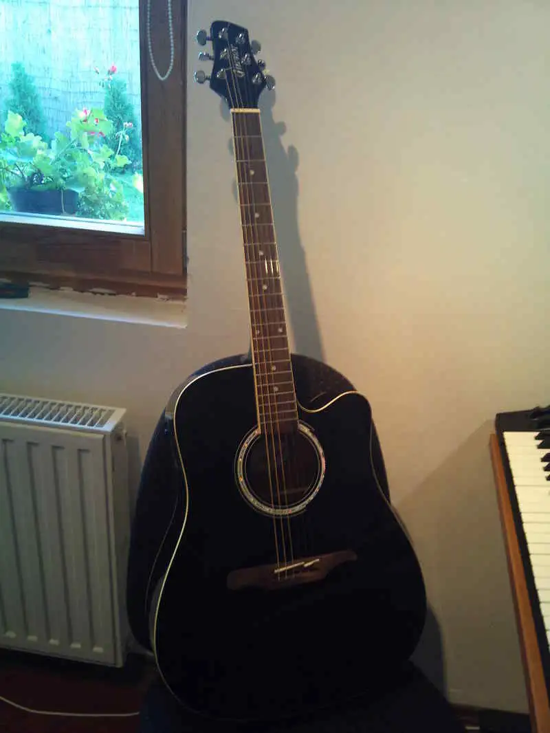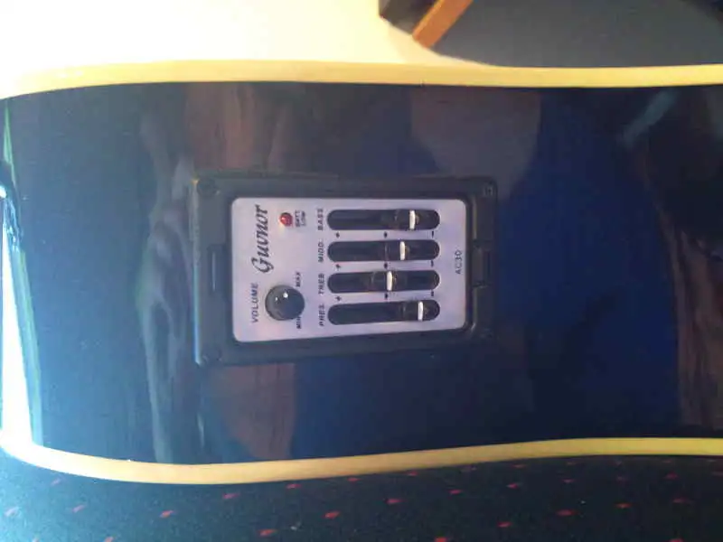 huendeskesGuvnor GA300CE-MB elektroakusztikus gitár, jó állapotban. Kezdőknek, hobbizenészeknek tökéletes. Elektronika hibátlanul üzemel, nem recseg, stb. Bejátszott, rendszeresen használt hangszer. A hátlapon a mindennapi használatból eredő kisebb karcok vannak, ahogy a képeken is látszik. A húrlábban a csont nem az eredeti gyári, én cseréltem. Alkudni lehet, de csak finoman :)