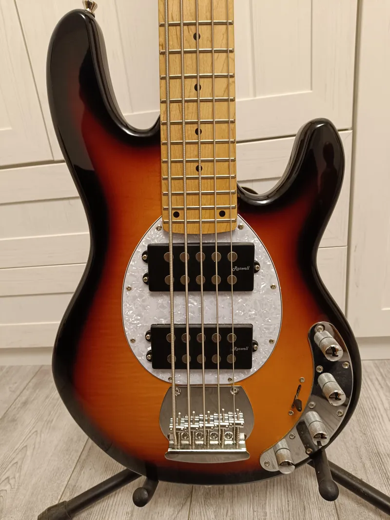 2 Roswell MFR5 MM Big Pole MM-stílusú humbucker hangszedő tekercsosztással és aktív előerősítővel, hangerő, közép, mély és magas hangok, 5-állású billenőkapcsoló. Jár hozzá egy viseltes félkemény tok.