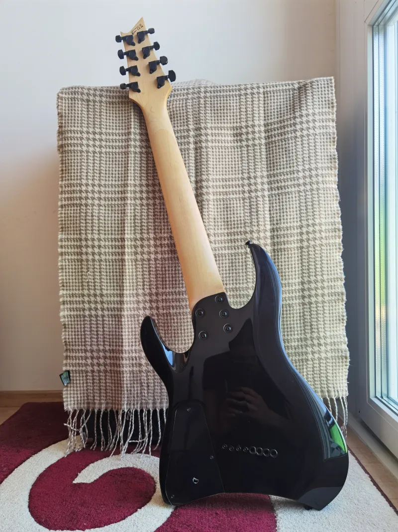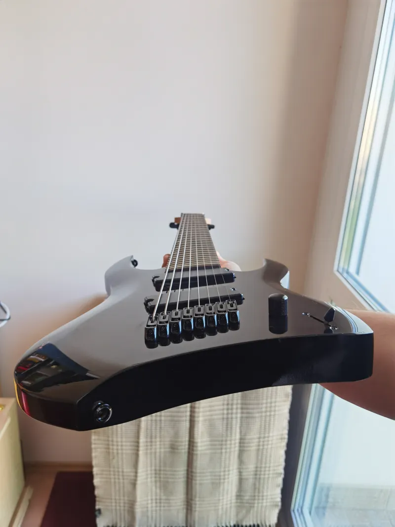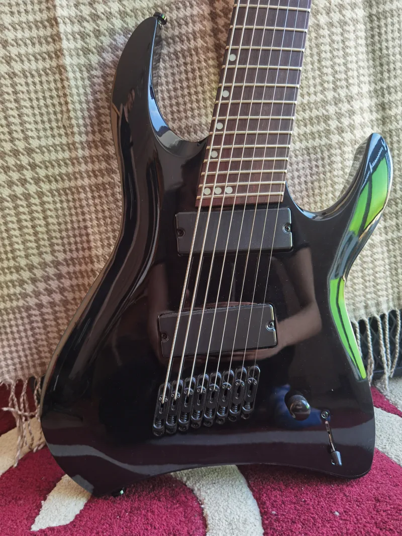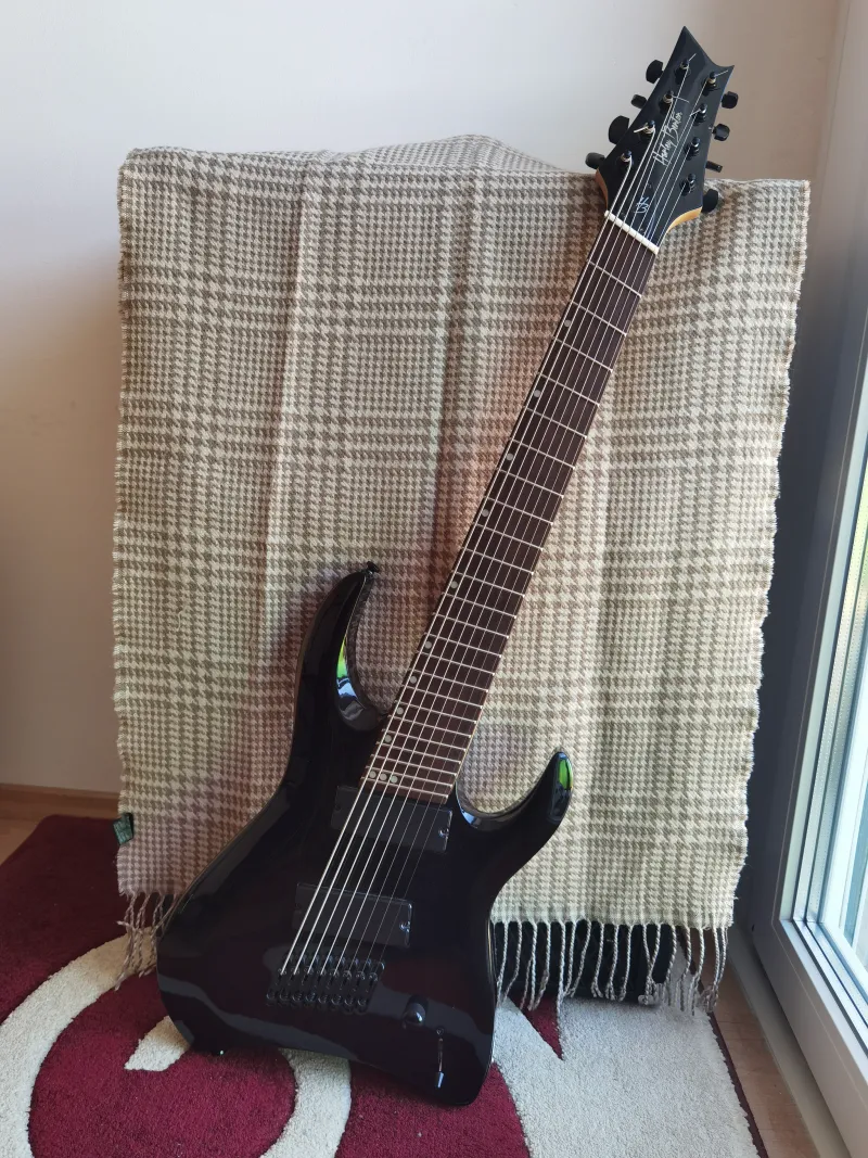 Sziasztok!Projekt meghiúsulása miatt eladó szeretett 8-húrosom. Ahogy a képeken is látszik, eléggé custom darab, kicsit Tosin Abasisítva lett a megjelenése. (Hangszerész által, nyugi:) A test kényelmességét javító kanyar mellé kapott a 2 plusz húr egy-egy Schaller hangolókulcsot, új jack aljzatot és 4db vaskosabb húrok befogadását engedő testen átmenő húrtartókat. A fejen található egy kisebb lakk leverődés, ezen kívül csini a megjelenése. Hangszedői EMG szabványnak megfelelnek, ha tovább szeretnéd tuningolni. Pöpec Ernie Ball szettel várja a próbákat!