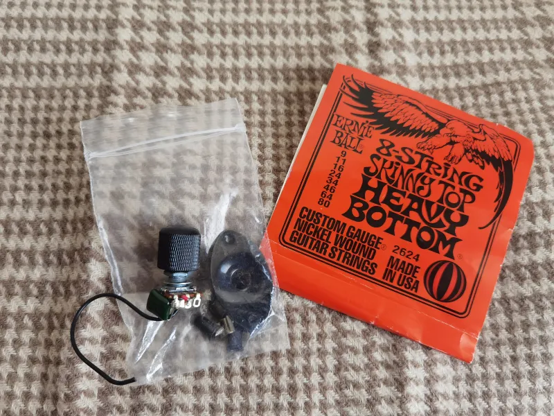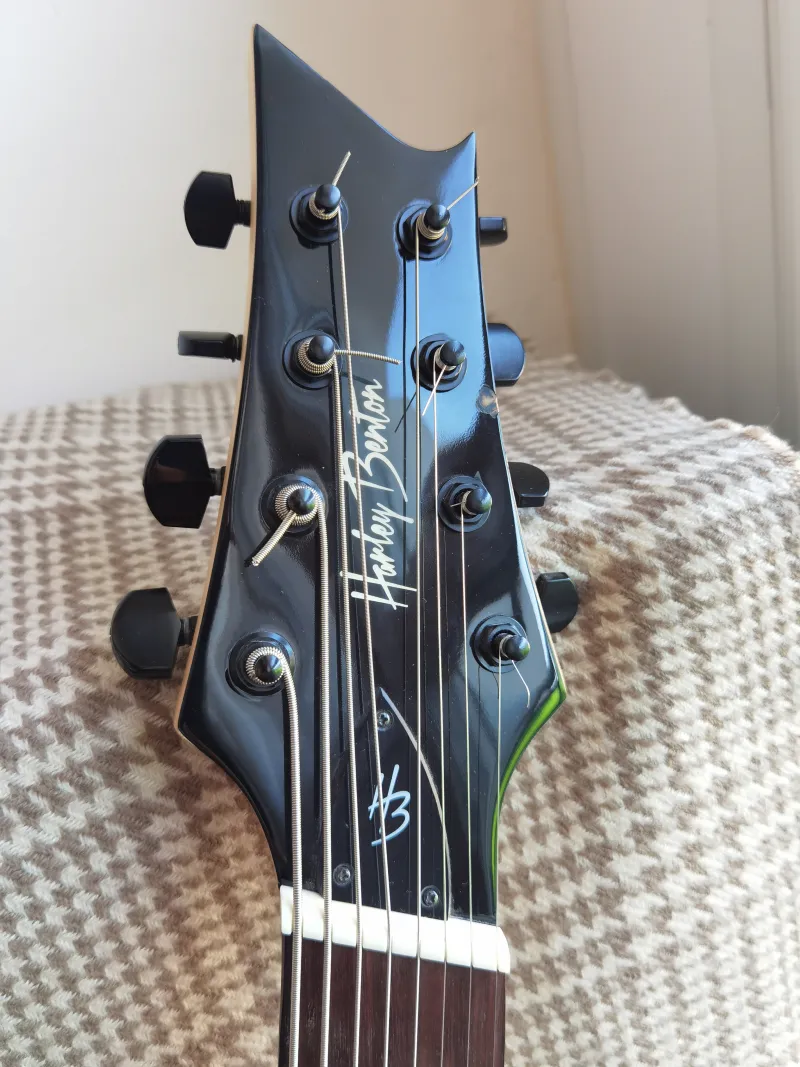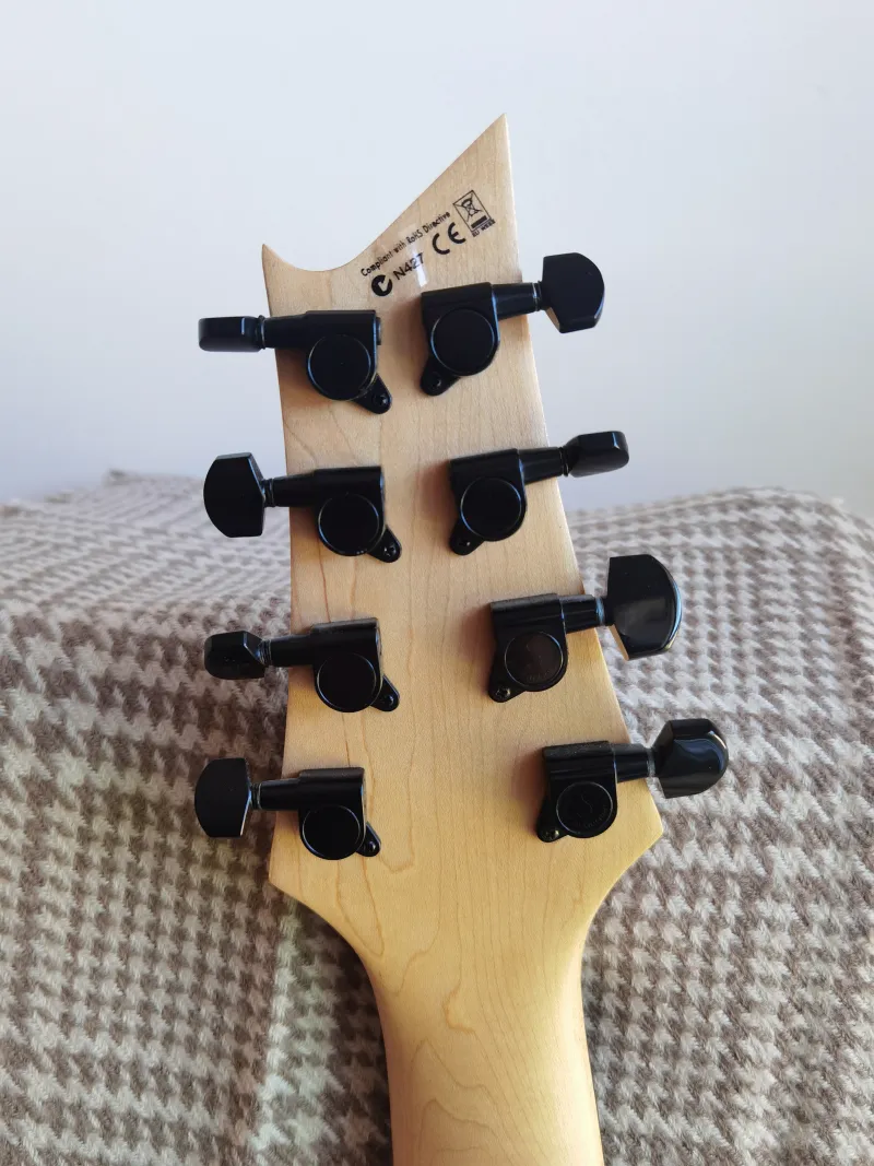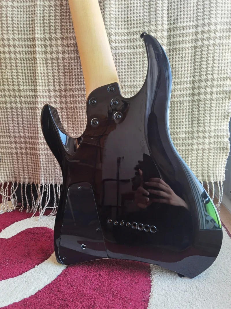 Sziasztok!Projekt meghiúsulása miatt eladó szeretett 8-húrosom. Ahogy a képeken is látszik, eléggé custom darab, kicsit Tosin Abasisítva lett a megjelenése. (Hangszerész által, nyugi:) A test kényelmességét javító kanyar mellé kapott a 2 plusz húr egy-egy Schaller hangolókulcsot, új jack aljzatot és 4db vaskosabb húrok befogadását engedő testen átmenő húrtartókat. A fejen található egy kisebb lakk leverődés, ezen kívül csini a megjelenése. Hangszedői EMG szabványnak megfelelnek, ha tovább szeretnéd tuningolni. Pöpec Ernie Ball szettel várja a próbákat!