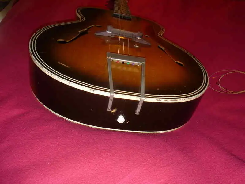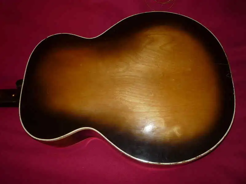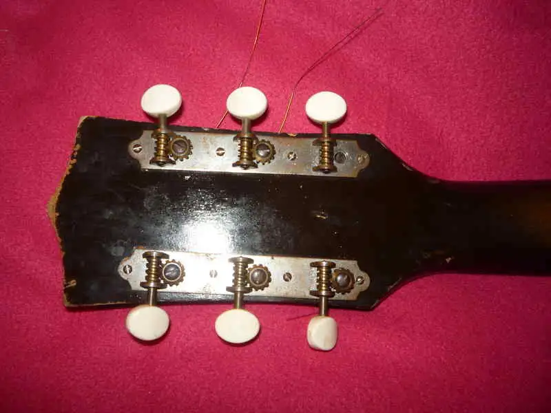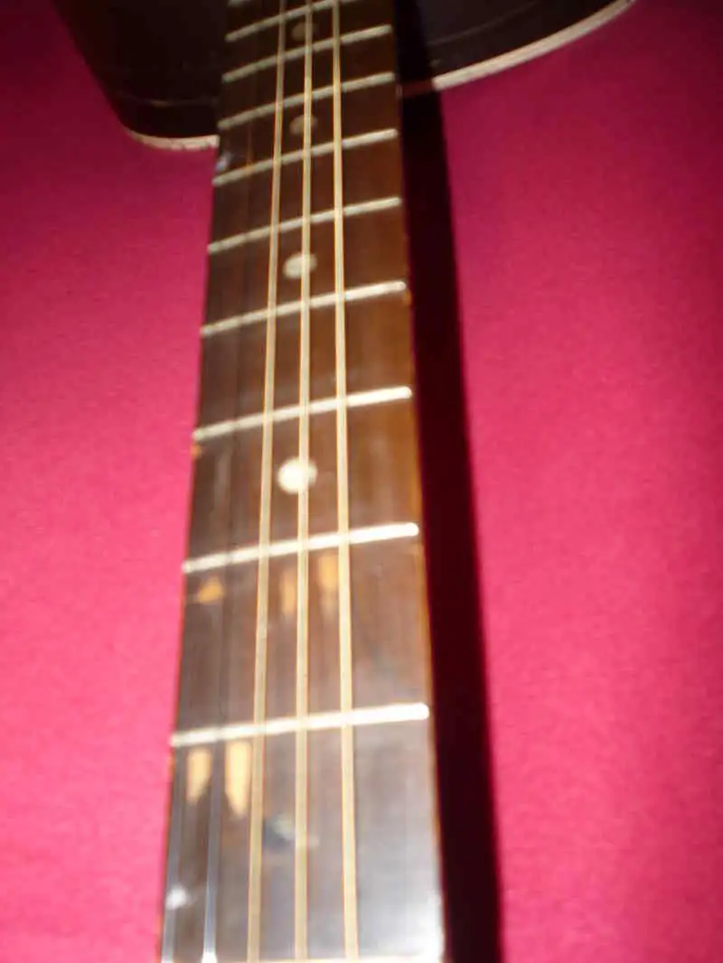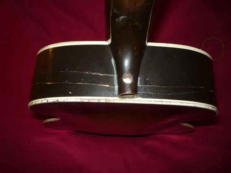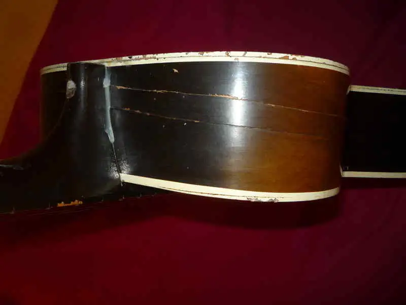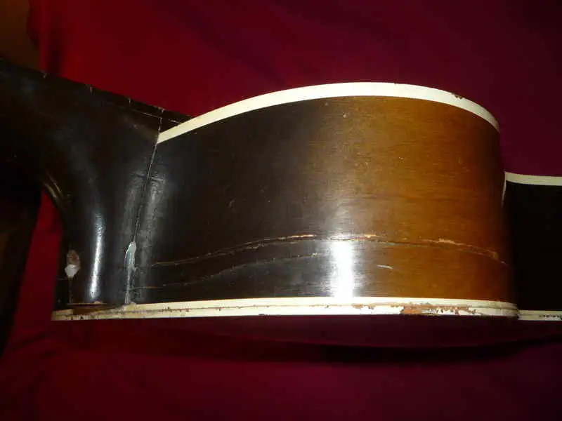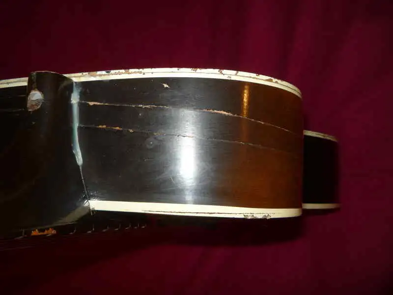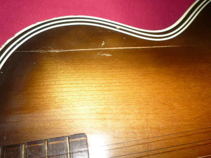 A test a felső részen több helyen meg van repedve kör-körös irányba. Ezek után valaki rögzítette a nyakat. Ez egyenes. Viszont a húrláb magasságából lett lecsiszolva, így megfelelő a húrok magassága. A húrok megfeszítésé után is ez az állapot megmarad. Örök garancia azért nincs rá.