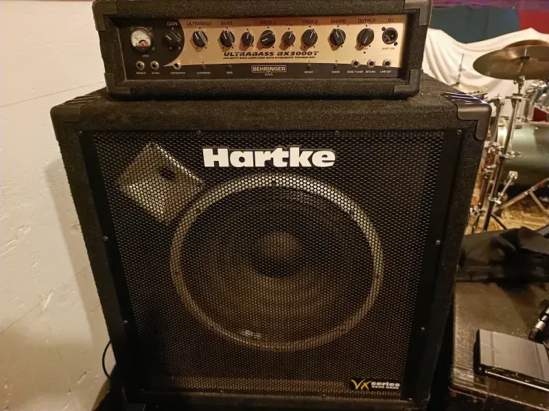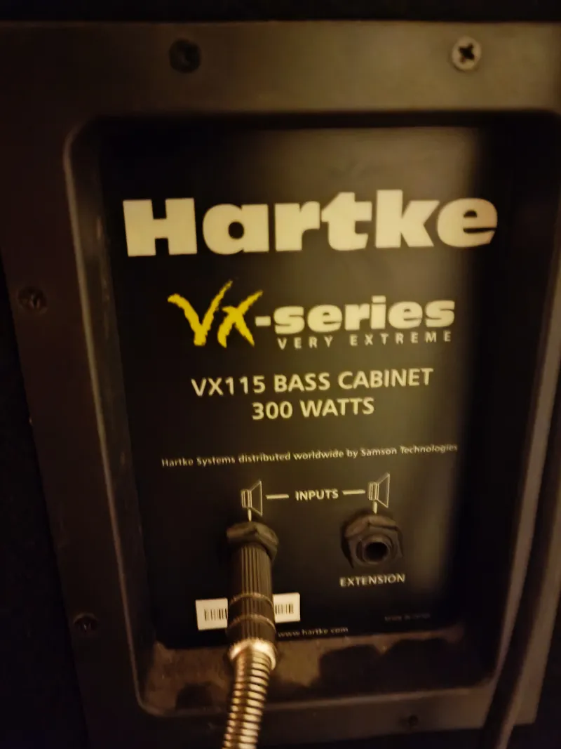 Hartke VX115 típusú 300W-os, egy 15˝ mély + magassugárzós. 8 ohmos, jack aljzatos be és kimenettel.