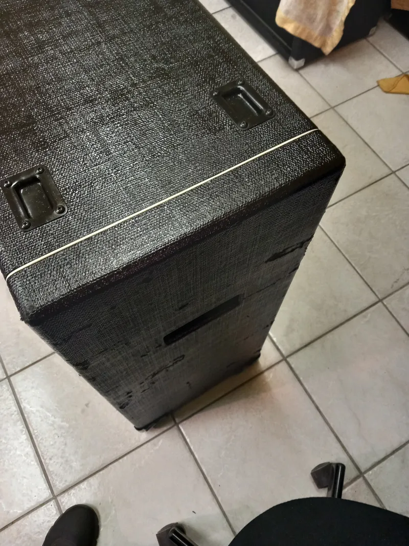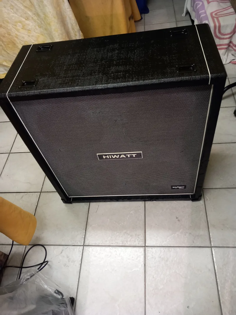 A mellékelt képeken látható állapotban lévő, kerekekre szerelt gyárilag, a láda tetején 4.db. fém süllyeszték van a gitár fej erősítő részére, Hiwatt M412 400. Wattos teljesítményű [4×30.cm átmérőjű hangszóróval, 100.W/16. Ohmos / db.szerelt.], MONÓBAN: 4 vagy 16 Ohmon lehet használni 400.w.