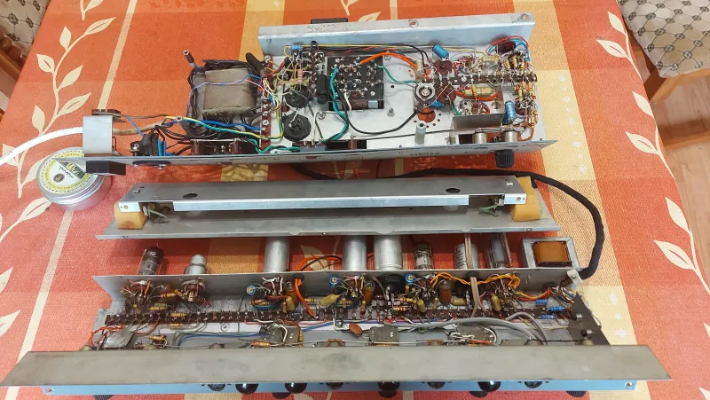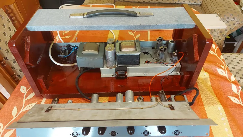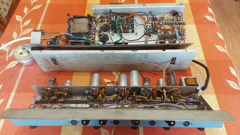 Hohner Orgaphon 25 MH csöves erősítő az Orgaphon 50 MH alapján új keményfa dobozban. Az erősítő felújítva, beállítva, minden csatorna funkciója hibátlanul működik. Új csőkészlettel: 5x 6N2P-EV=ECC83, 1x Tungstram EF86, 1x AEG ECL86, 2x Polam ELÉ84. Négy független csatorna különböző jelszíntű bemenetekkel. Mind a négy csatornán Volume, Treble, Bass. Csöves vezérlésű rugós zengető, vibrato, Standby. A Hall/reverb mind a négy csatornán külön szabályozható és a vibratohoz hasonlóan lábkapcsolóval kikapcsolható. A reverb és a vibrato hangja valóban látványos. Hangfal kimenet: 16 és 8 Ohm. Az Orgaphon legendás a sokoldalúságáról. Tiszta hang, nagyon szép Blue-os hangkarakterrel.(545x230x240 mm)