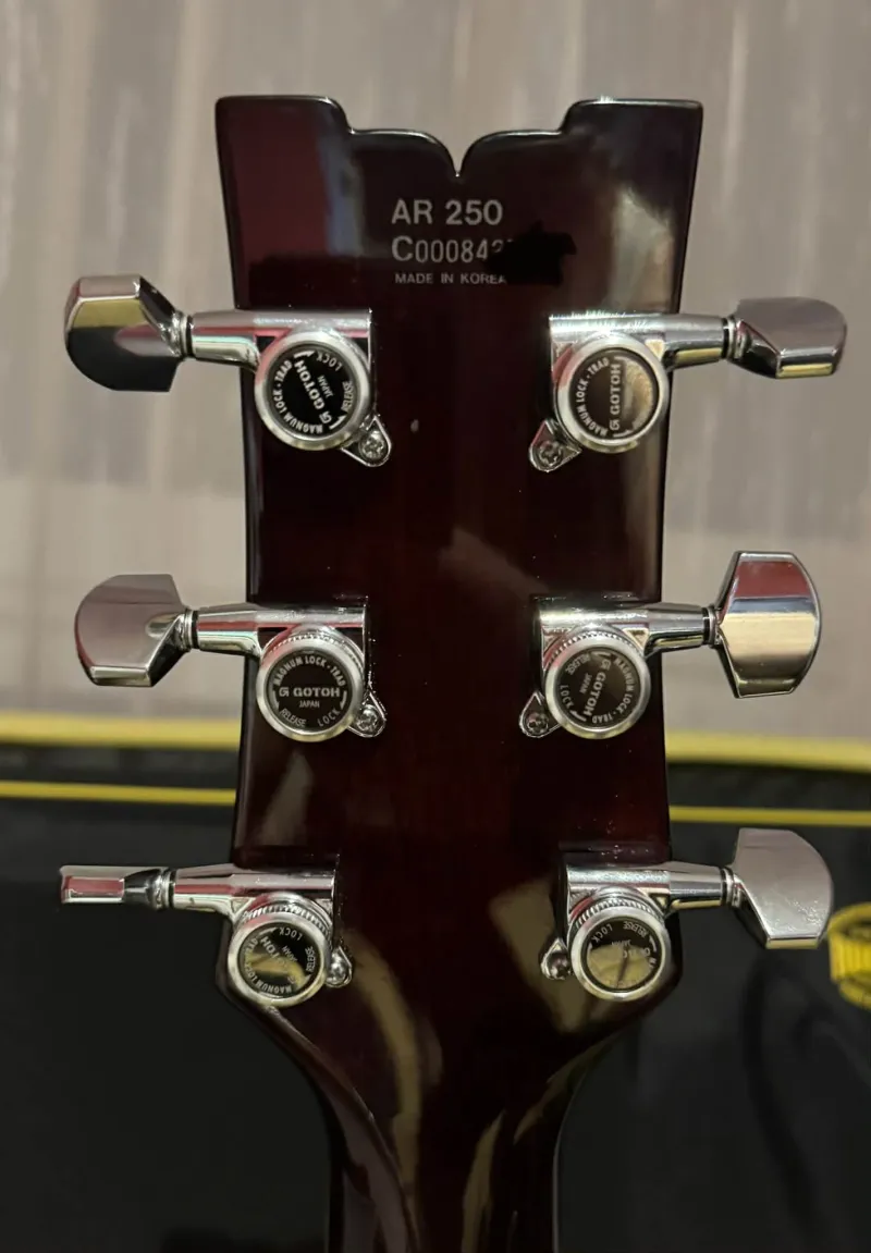 Ibanez Artist AR 250, 2000-es évjárat Made in Korea, modolva, Gotoh új satus kulcsok, új kapcsoló, Push-pull hangerő potik így felezhetőek a pick-upok, frissen síkolva beállítva, mahagóni test, ragasztott nyak, rózsafa fogólap könnyen játszható, szép állapotú gitár kemény tokkal eladó.Kapcsolódó hangszerteszt (1)