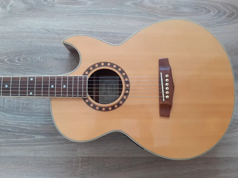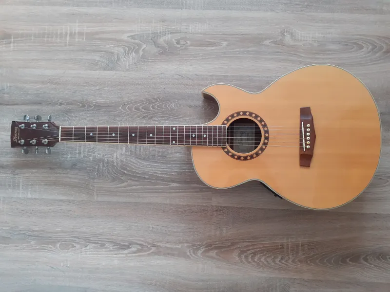 Ibanez Peformance széria, a pontos modell szám: Ibanez PC300 CENT1201, nagyon szép állapotban eladó.Fenyő fedlap, gyönyörű cutaway forma, klassz hang akusztikusan és elektromosan is. A piezzo hangja is telt, nem csipogó.