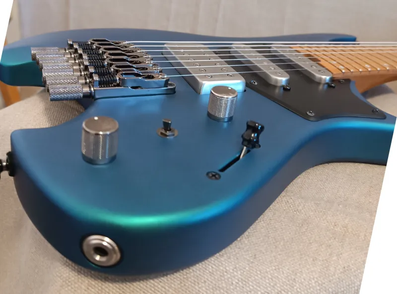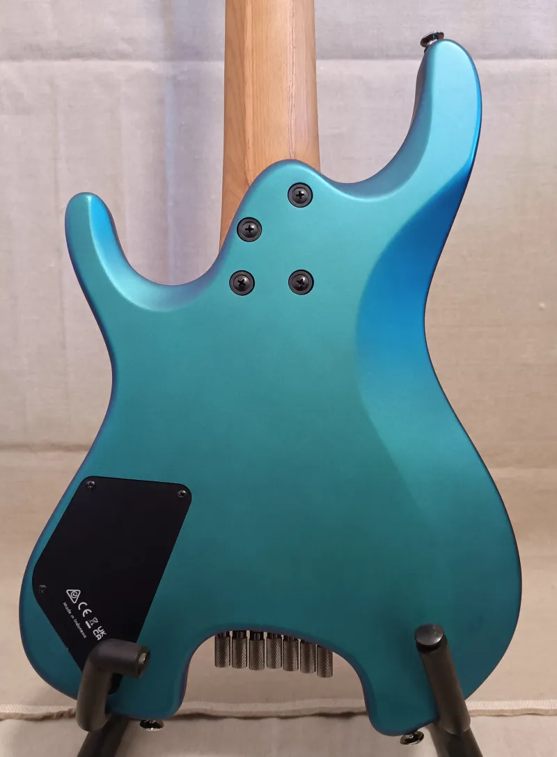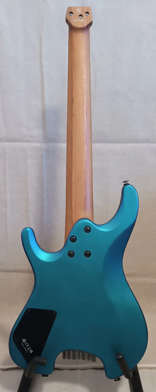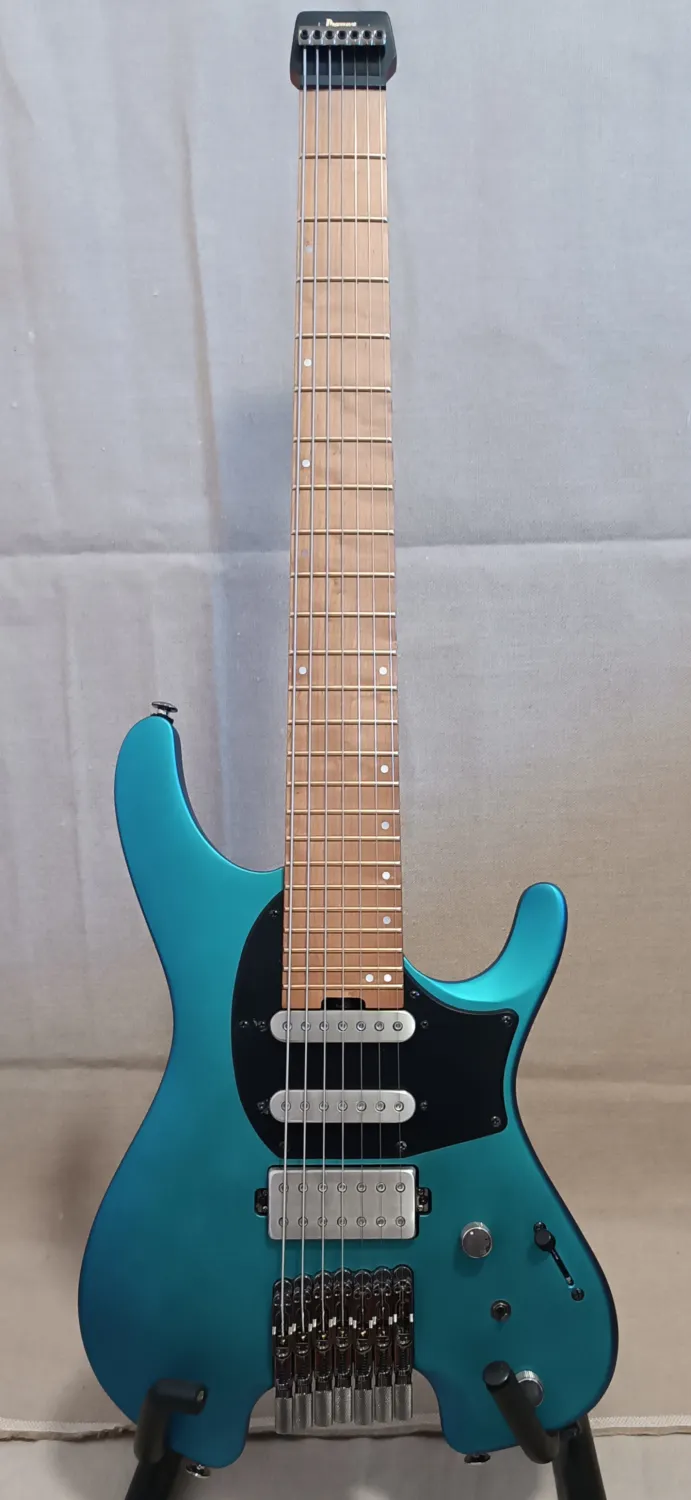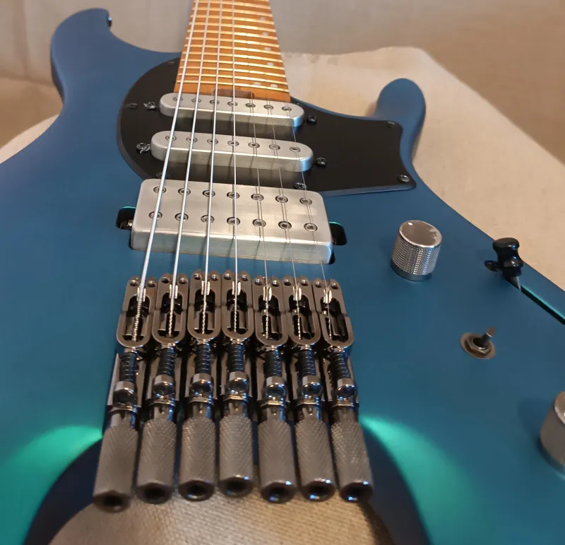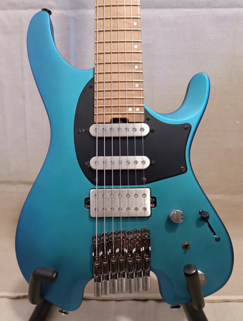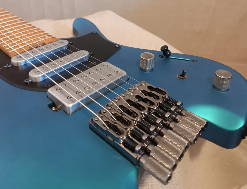 Újszerű állapotú, 2022 év végi gyártású Ibanez Q547-BMM , kék kaméleon színű 7 húros gitár eladó. Wizard, öt részből álló (lángolt juhar-bubinga) nyak, égetett juhar fogólap, 25,5 col menzúra, gyöngyház pozíció jelölőkkel, Nyatoh test. Két R1 egytekercses és egy Q58 humbucker hangszedők. Mind nagyon jól kiegyensúlyozott, kerámia mágnese hangszedő. Erőteljes és tiszta mélyek, harsányságot mellőző világos és jól definiált magasak. Dyna MIX9 kapcsolás. Az ötállású kapcsoló mellett van egy kétállású kapcsoló. Ezekkel kilenc karakteres hangzás érhető el. A nyak és közép hangszedők sorba kapcsolásával egy két humbuckeres gitár hang is rendelkezésre áll ahol a nyaki hangszedő inkább egy widerange humbuckerre emlékeztet. Az Ibanez honlapján érdemes utána nézni, hogy milyen hangszedő kombinációk vannak. A 2,47 kg tömegű gitár nagyon jól kiegyensúlyozott. A hangzás és ergonómia igazi élményt nyújt. A húrozás, hangolás pofon egyszerű. A beállításhoz minden szerszám , és a jó védelmet nyújtó gyári puha tok is tartozék.Szállítás