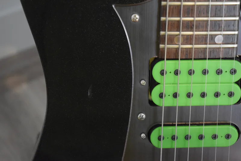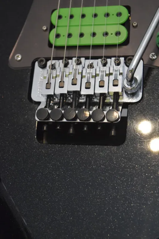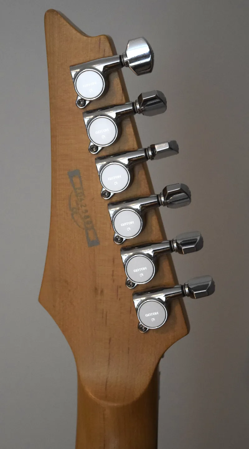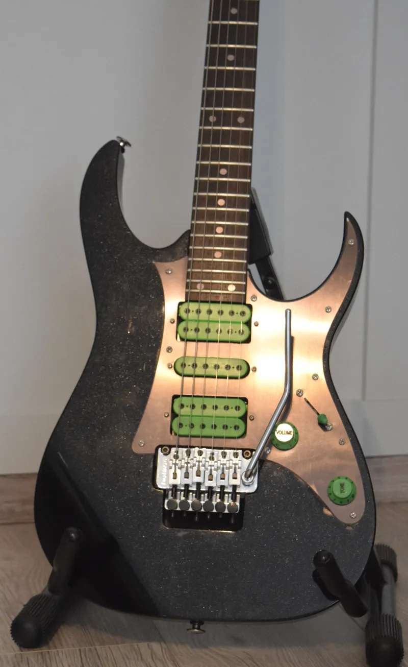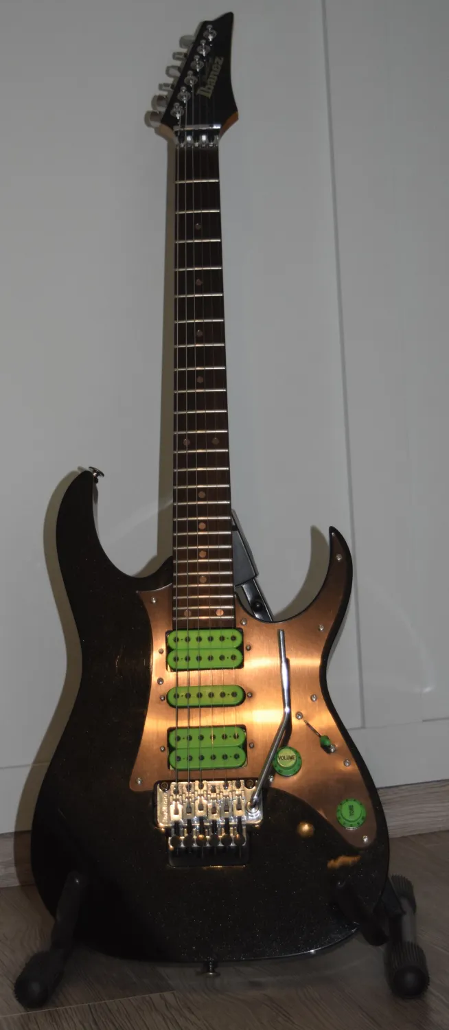 A gyáritól eltérő felszereltséggel: kb 2 éves Schaller Lockmeister tremoló (a test átalakítása nélkül belement, pontos, berreg), króm Gotoh kulcsok, DiMarzio PAF Pro (nyak) Dark Matter (közép) Super Distortion (híd) hangszedőkkel. Igazi Vai Universe vibe.