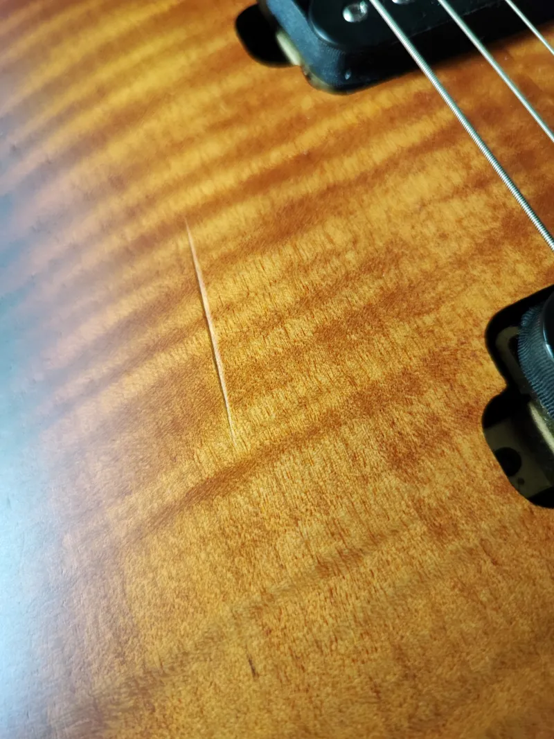 Mindkét sérülést fotóztam. A felületén lévő karccal együtt vettem, az előző tulajnál keletkezett, nem tudom mi okozta. Az elektronikatakaró fedélnél lévő lepattanás viszont az én hibám: a hangszert elektronikahibával vettem, és javítás közben a szoros fedél kifeszítésekor sérült meg.