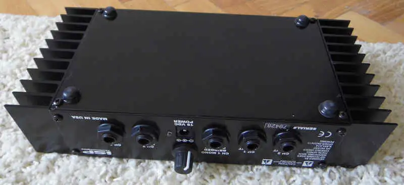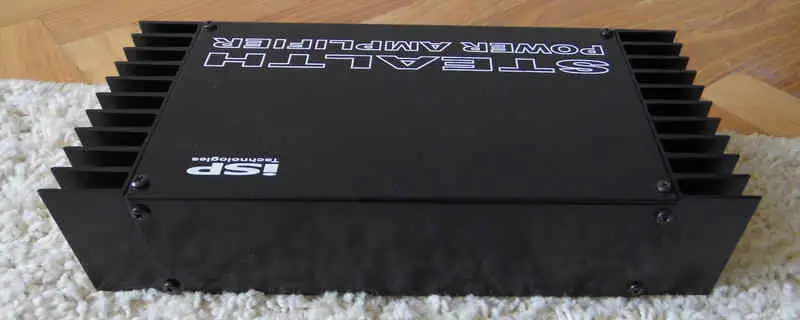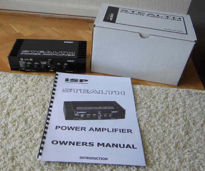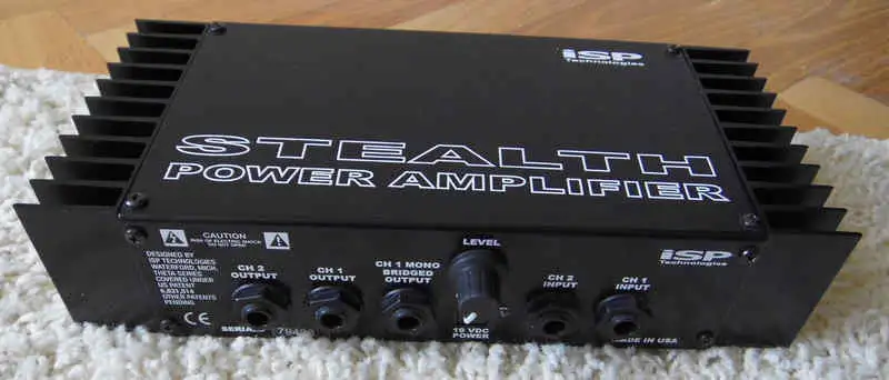 ISP Technologies Stealth Power-Amp , stereo: 2 x 75W RMS @ 4 ohms, 2 x 60W @ 8 ohms, mono bypass: 140W @ 8 ohm or 80W RMS @ 16 ohms, smallest lightest high power amplifier for the guitarist available 22,86cm X 10,16cm X 5,08cm and 0,54 kg weight, external 19VCD switch-mode power supply included for operation from 100VAC to 240VAC, class A/B amplifier circuit for analog saturation and clipping sonic performance, internal protection for shorts and open circuit, time delay operation for POP free turn on / turn off.
