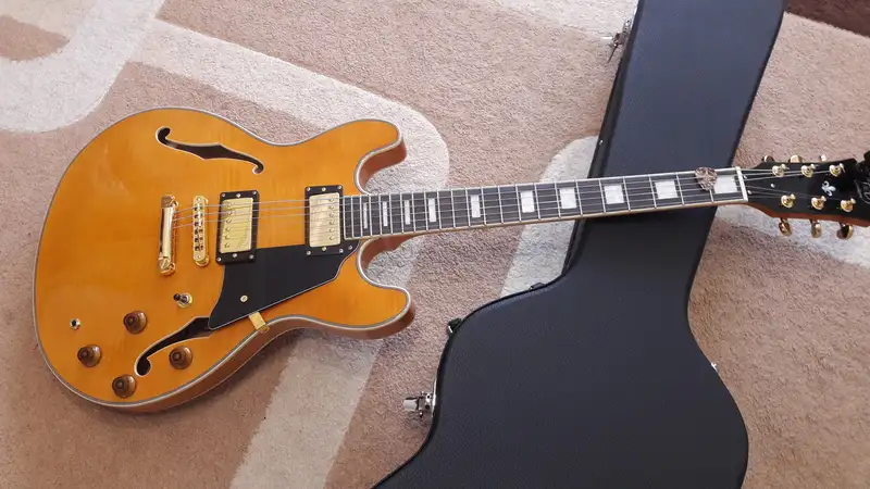 2 x kerámia Humbucker hangszedő. Blues-rock stílusra termett hangszer. Na meg jól áll neki a jazz is :)! Háromutas hangszedőkapcsoló. Arany színű hardverrel és stílusos ˝F lyukakkal˝ készült.