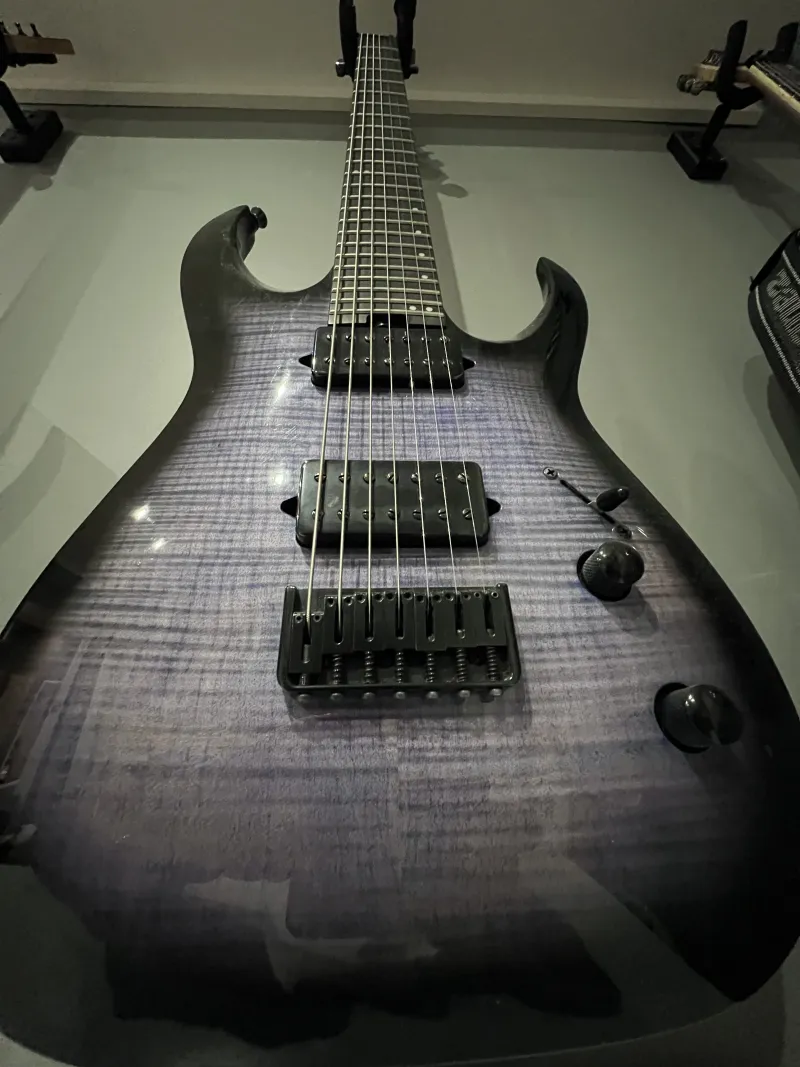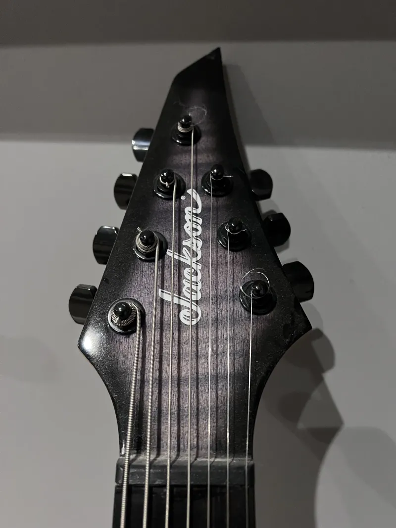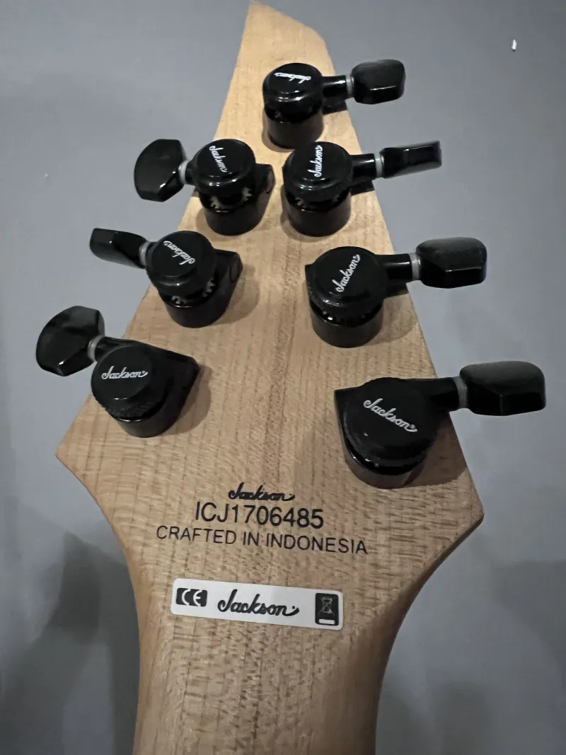 Eladó: Jackson Pro Series Misha Mansoor Juggernaut HT7FMProfesszionális 7 húros gitár lángolt juhar (FM) tetővel, 26.5˝ skálával és fix HT7 híddal. Jackson MM1 humbuckerek, 5 állású kapcsoló, push-pull tone, ébenfa fogólap és Luminlay jelölők. Kiváló állapot, modern metalhoz és progresszív játékhoz ideális. Megbízható hangolás, kényelmes nyak, erős és tiszta hangzás.